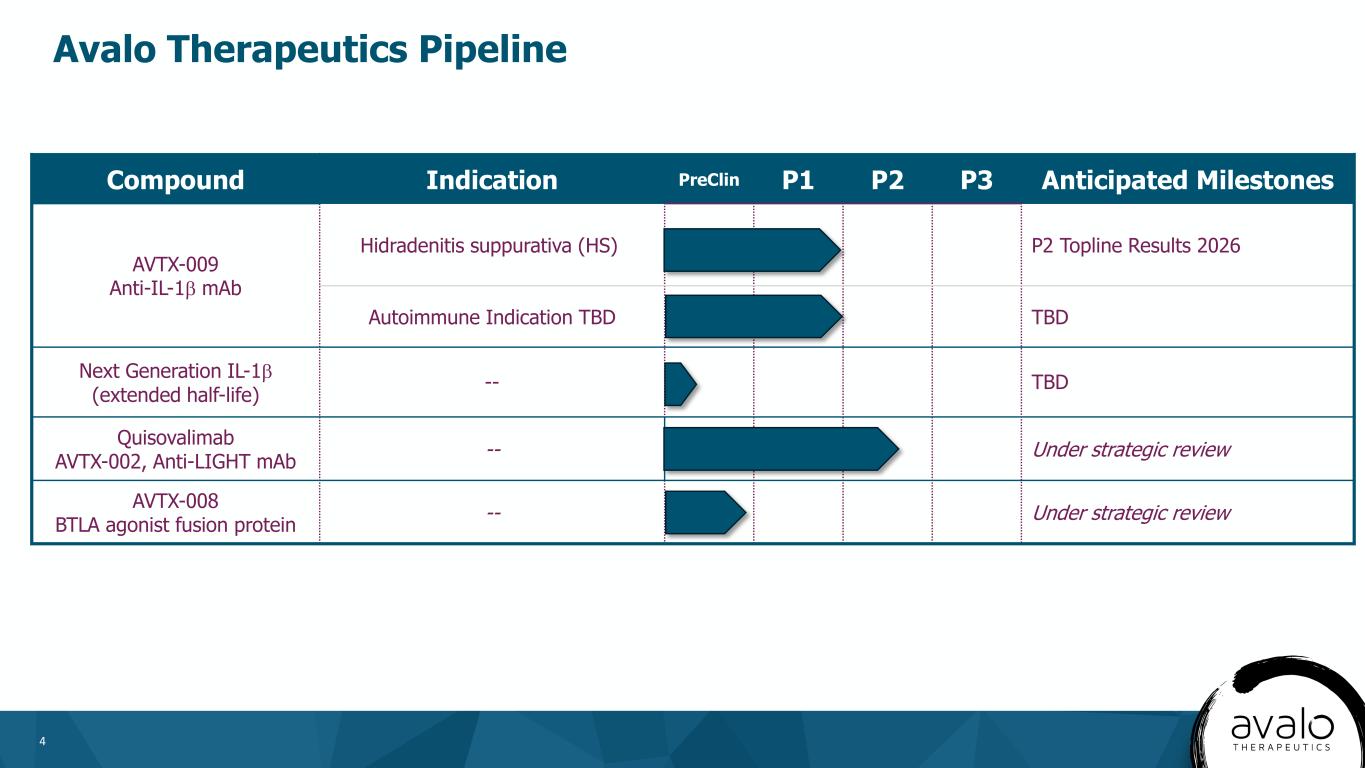 3 Experienced team with a proven track record of late-stage immunology development NASDAQ Listed: AVTX Private company largely consisting of Phase 2-ready Anti-IL-1β mAb and related assets De-risked MOA in target indications AlmataBio, Inc. Leader in biologics to treat inflammation with a focus on AVTX-009 (Anti-IL-1β mAb) Hidradenitis Suppurativa Topline Results 2026 NASDAQ Listed: AVTX Concurrent with the acquisition of AVTX-009, Avalo announced a PIPE financing of up to $185M providing cash runway into 2027 Avalo Therapeutics & AlmataBio: A Strong Strategic Fit to Drive Long-Term Growth