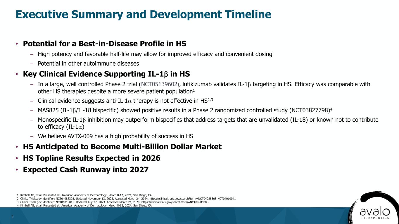 4 Compound Indication PreClin P1 P2 P3 Anticipated Milestones AVTX-009 Anti-IL-1β mAb Hidradenitis suppurativa (HS) P2 Topline Results 2026 Autoimmune Indication TBD TBD Next Generation IL-1β (extended half-life) -- TBD Quisovalimab AVTX-002, Anti-LIGHT mAb -- Under strategic review AVTX-008 BTLA agonist fusion protein -- Under strategic review Avalo Therapeutics Pipeline