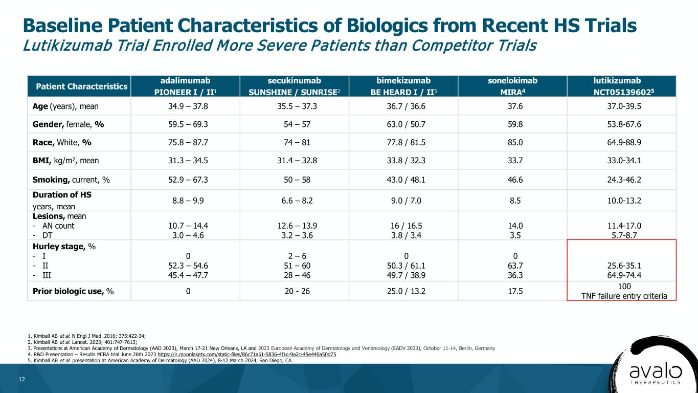 11 • Inflammatory cascade in HS is triggered by various external stimuli – Smoking, dysbiosis, or mechanical stress • IL-1β is a key driver of the inflammatory cascade that leads to the destruction of the pilosebaceous unit – Increased IL-1β levels in lesional skin2,3 – Genetic associations4 – Clinical benefit has been observed with anti-IL-1 drugs IL-1β is Strongly Implicated in the Pathophysiology of HS1 1. Calabrese L, et al. Biomolecules. 2024;14(2):175 2. Vossen ARJV, et al. J Invest Dermatol. 2020;140(7):1463-1466.e2 3. Kelly G, et al. Br J Dermatol. 2015;173(6):1431-1439 4. Marzano AV, et al. Dermatology. 2022;238(5):860-869 DAMPs, damage-associated molecular pattern molecules; DC, dendritic cell; IL, interleukin; IL-R, interleukin receptor; PAMPs, pathogen-associated molecular pattern molecules.