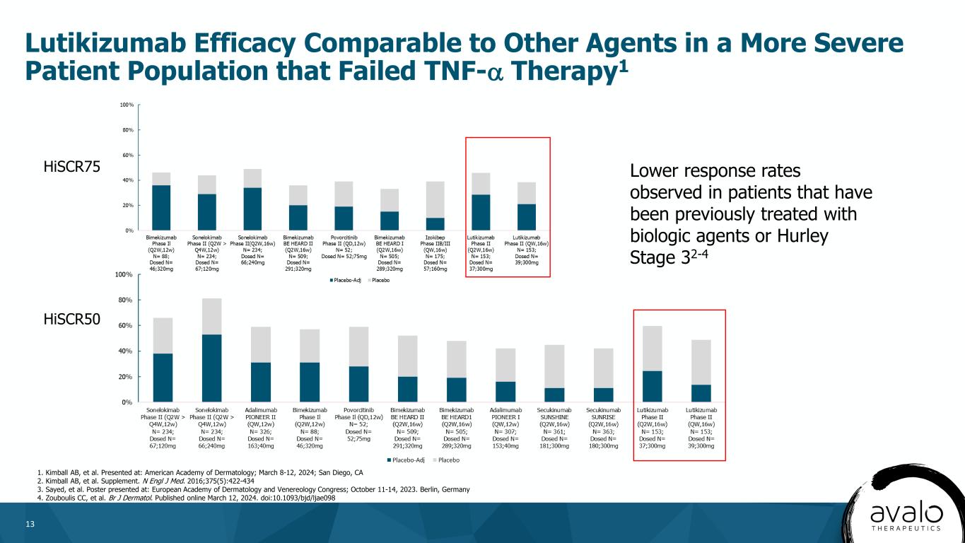12 Baseline Patient Characteristics of Biologics from Recent HS Trials Lutik izumab Trial Enrolled More Severe Patients than Competitor Trials 1. Kimball AB et al. N Engl J Med. 2016; 375:422-34; 2. Kimball AB et al. Lancet. 2023; 401:747-7613; 3. Presentations at American Academy of Dermatology (AAD 2023), March 17-21 New Orleans, LA and 2023 European Academy of Dermatology and Venereology (EADV 2023), October 11-14, Berlin, Germany 4. R&D Presentation – Results MIRA trial June 26th 2023 https://ir.moonlaketx.com/static-files/86c71a51-5836-4f1c-9a2c-45e440a50d75 5. Kimball AB et al. presentation at American Academy of Dermatology (AAD 2024), 8-12 March 2024, San Diego, CA Patient Characteristics adalimumab PIONEER I / II1 secukinumab SUNSHINE / SUNRISE2 bimekizumab BE HEARD I / II3 sonelokimab MIRA4 lutikizumab NCT051396025 Age (years), mean 34.9 – 37.8 35.5 – 37.3 36.7 / 36.6 37.6 37.0-39.5 Gender, female, % 59.5 – 69.3 54 – 57 63.0 / 50.7 59.8 53.8-67.6 Race, White, % 75.8 – 87.7 74 – 81 77.8 / 81.5 85.0 64.9-88.9 BMI, kg/m2, mean 31.3 – 34.5 31.4 – 32.8 33.8 / 32.3 33.7 33.0-34.1 Smoking, current, % 52.9 – 67.3 50 – 58 43.0 / 48.1 46.6 24.3-46.2 Duration of HS years, mean 8.8 – 9.9 6.6 – 8.2 9.0 / 7.0 8.5 10.0-13.2 Lesions, mean - AN count - DT 10.7 – 14.4 3.0 – 4.6 12.6 – 13.9 3.2 – 3.6 16 / 16.5 3.8 / 3.4 14.0 3.5 11.4-17.0 5.7-8.7 Hurley stage, % - I - II - III 0 52.3 – 54.6 45.4 – 47.7 2 – 6 51 – 60 28 – 46 0 50.3 / 61.1 49.7 / 38.9 0 63.7 36.3 25.6-35.1 64.9-74.4 Prior biologic use, % 0 20 - 26 25.0 / 13.2 17.5 100 TNF failure entry criteria