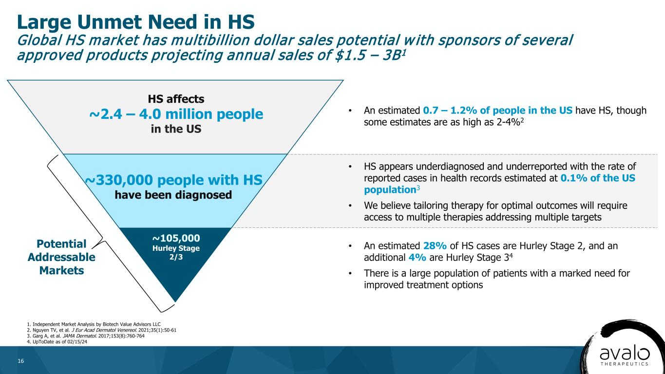 15 MAS825 May Provide Further Clinical Evidence for IL-1β in HS 1. ClinicalTrials.gov identifier: NCT03827798. Updated January 21, 2023. Accessed March 24, 2024. https://clinicaltrials.gov/search?term=NCT03827798 2. Kimball AB, et al. Presented at: American Academy of Dermatology; March 8-12, 2024; San Diego, CA • Novartis’ MAS825 is a bispecific inhibitor of IL-1β and IL-18 • MAS825 arm succeeded in a placebo-controlled platform trial in HS1,2 • To our knowledge, there is no other clinical validation of IL-18 inhibition in HS • Unlike IL-1β, IL-18 is not strongly implicated in the pathophysiology of HS