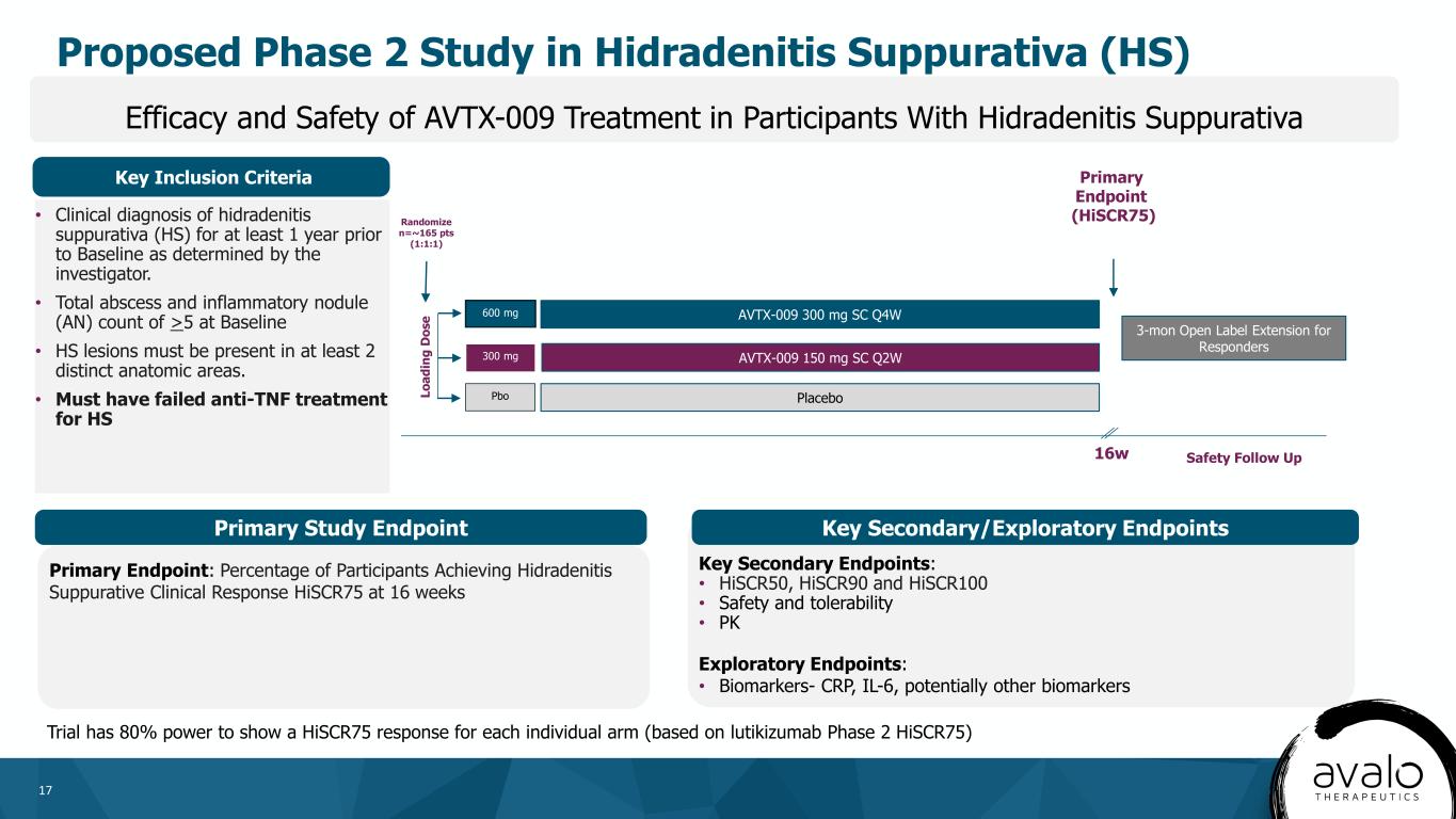 16 • An estimated 28% of HS cases are Hurley Stage 2, and an additional 4% are Hurley Stage 34 • There is a large population of patients with a marked need for improved treatment options 1. Independent Market Analysis by Biotech Value Advisors LLC 2. Nguyen TV, et al. J Eur Acad Dermatol Venereol. 2021;35(1):50-61 3. Garg A, et al. JAMA Dermatol. 2017;153(8):760-764 4. UpToDate as of 02/15/24 • An estimated 0.7 – 1.2% of people in the US have HS, though some estimates are as high as 2-4%2 Potential Addressable Markets • HS appears underdiagnosed and underreported with the rate of reported cases in health records estimated at 0.1% of the US population3 • We believe tailoring therapy for optimal outcomes will require access to multiple therapies addressing multiple targets Large Unmet Need in HS Global HS market has multibillion dollar sales potential w ith sponsors of several approved products projecting annual sales of $1.5 – 3B1 HS affects ~2.4 – 4.0 million people in the US ~105,000 Hurley Stage 2/3 ~330,000 people with HS have been diagnosed