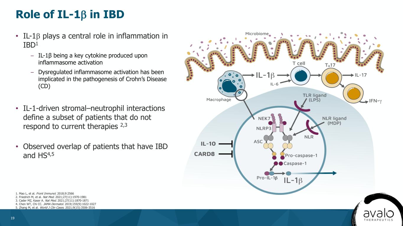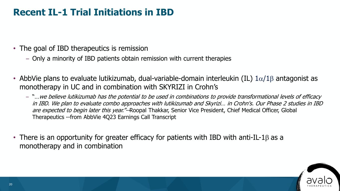 19 • IL-1β plays a central role in inflammation in IBD1 – IL-1β being a key cytokine produced upon inflammasome activation – Dysregulated inflammasome activation has been implicated in the pathogenesis of Crohn’s Disease (CD) • IL-1-driven stromal–neutrophil interactions define a subset of patients that do not respond to current therapies 2,3 • Observed overlap of patients that have IBD and HS4,5 Role of IL-1β in IBD ://doi.org/10.3389/fimmu.2018.02566 1. Mao L, et al. Front Immunol. 2018;9:2566 2. Friedrich M, et al. Nat Med. 2021;27(11):1970-1981 3. Cader MZ, Kaser A. Nat Med. 2021;27(11):1870-1871 4. Chen WT, Chi CC. JAMA Dermatol. 2019;155(9):1022-1027 5. Zhang M, et al. World J Clin Cases. 2021;9(15):3506-3516