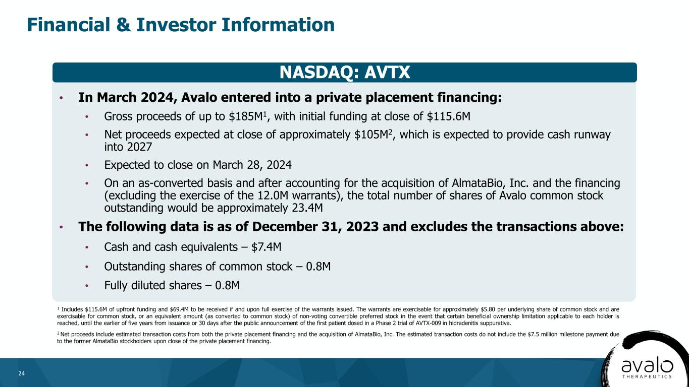 24 • In March 2024, Avalo entered into a private placement financing: • Gross proceeds of up to $185M1, with initial funding at close of $115.6M • Net proceeds expected at close of approximately $105M2, which is expected to provide cash runway into 2027 • Expected to close on March 28, 2024 • On an as-converted basis and after accounting for the acquisition of AlmataBio, Inc. and the financing (excluding the exercise of the 12.0M warrants), the total number of shares of Avalo common stock outstanding would be approximately 23.4M • The following data is as of December 31, 2023 and excludes the transactions above: • Cash and cash equivalents – $7.4M • Outstanding shares of common stock – 0.8M • Fully diluted shares – 0.8M NASDAQ: AVTX Financial & Investor Information 1 Includes $115.6M of upfront funding and $69.4M to be received if and upon full exercise of the warrants issued. The warrants are exercisable for approximately $5.80 per underlying share of common stock and are exercisable for common stock, or an equivalent amount (as converted to common stock) of non-voting convertible preferred stock in the event that certain beneficial ownership limitation applicable to each holder is reached, until the earlier of five years from issuance or 30 days after the public announcement of the first patient dosed in a Phase 2 trial of AVTX-009 in hidradenitis suppurativa. 2 Net proceeds include estimated transaction costs from both the private placement financing and the acquisition of AlmataBio, Inc. The estimated transaction costs do not include the $7.5 million milestone payment due to the former AlmataBio stockholders upon close of the private placement financing.