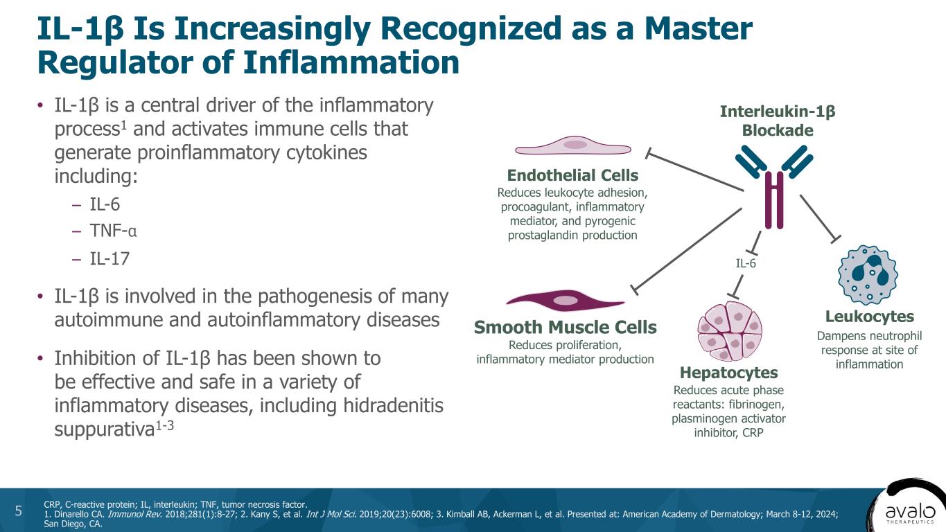IL-1β Is Increasingly Recognized as a Master Regulator of Inflammation • IL-1β is a central driver of the inflammatory process1 and activates immune cells that generate proinflammatory cytokines including: – IL-6 – TNF-α – IL-17 • IL-1β is involved in the pathogenesis of many autoimmune and autoinflammatory diseases • Inhibition of IL-1β has been shown to be effective and safe in a variety of inflammatory diseases, including hidradenitis suppurativa1-3 Interleukin-1β Blockade Endothelial Cells Reduces leukocyte adhesion, procoagulant, inflammatory mediator, and pyrogenic prostaglandin production Smooth Muscle Cells Reduces proliferation, inflammatory mediator production Hepatocytes Reduces acute phase reactants: fibrinogen, plasminogen activator inhibitor, CRP Leukocytes IL-6 Dampens neutrophil response at site of inflammation CRP, C-reactive protein; IL, interleukin; TNF, tumor necrosis factor. 1. Dinarello CA. Immunol Rev. 2018;281(1):8-27; 2. Kany S, et al. Int J Mol Sci. 2019;20(23):6008; 3. Kimball AB, Ackerman L, et al. Presented at: American Academy of Dermatology; March 8-12, 2024; San Diego, CA. 5