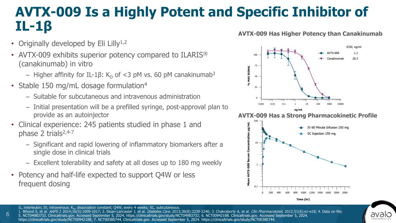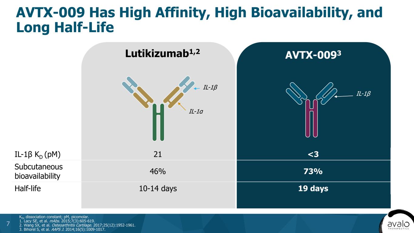 AVTX-009 Is a Highly Potent and Specific Inhibitor of IL-1β IL, interleukin; IV, intravenous; KD, dissociation constant; Q4W, every 4 weeks; SC, subcutaneous. 1. Bihorel S, et al. AAPS J. 2014;16(5):1009-1017; 2. Sloan-Lancaster J, et al. Diabetes Care. 2013;36(8):2239-2246; 3. Chakraborty A, et al. Clin Pharmacokinet. 2012;51(6):e1-e18; 4. Data on file; 5. NCT04983732. Clinicaltrials.gov. Accessed September 5, 2024. https://clinicaltrials.gov/study/NCT04983732; 6. NCT00942188. Clinicaltrials.gov. Accessed September 5, 2024. https://clinicaltrials.gov/study/NCT00942188; 7. NCT00380744. Clinicaltrials.gov. Accessed September 5, 2024. https://clinicaltrials.gov/study/NCT00380744. 6 • Originally developed by Eli Lilly1,2 • AVTX-009 exhibits superior potency compared to ILARIS® (canakinumab) in vitro – Higher affinity for IL-1β: KD of <3 pM vs. 60 pM canakinumab3 • Stable 150 mg/mL dosage formulation4 – Suitable for subcutaneous and intravenous administration – Initial presentation will be a prefilled syringe, post-approval plan to provide as an autoinjector • Clinical experience: 245 patients studied in phase 1 and phase 2 trials2,4-7 – Significant and rapid lowering of inflammatory biomarkers after a single dose in clinical trials – Excellent tolerability and safety at all doses up to 180 mg weekly • Potency and half-life expected to support Q4W or less frequent dosing AVTX-009 Has Higher Potency than Canakinumab AVTX-009 Has a Strong Pharmacokinetic Profile