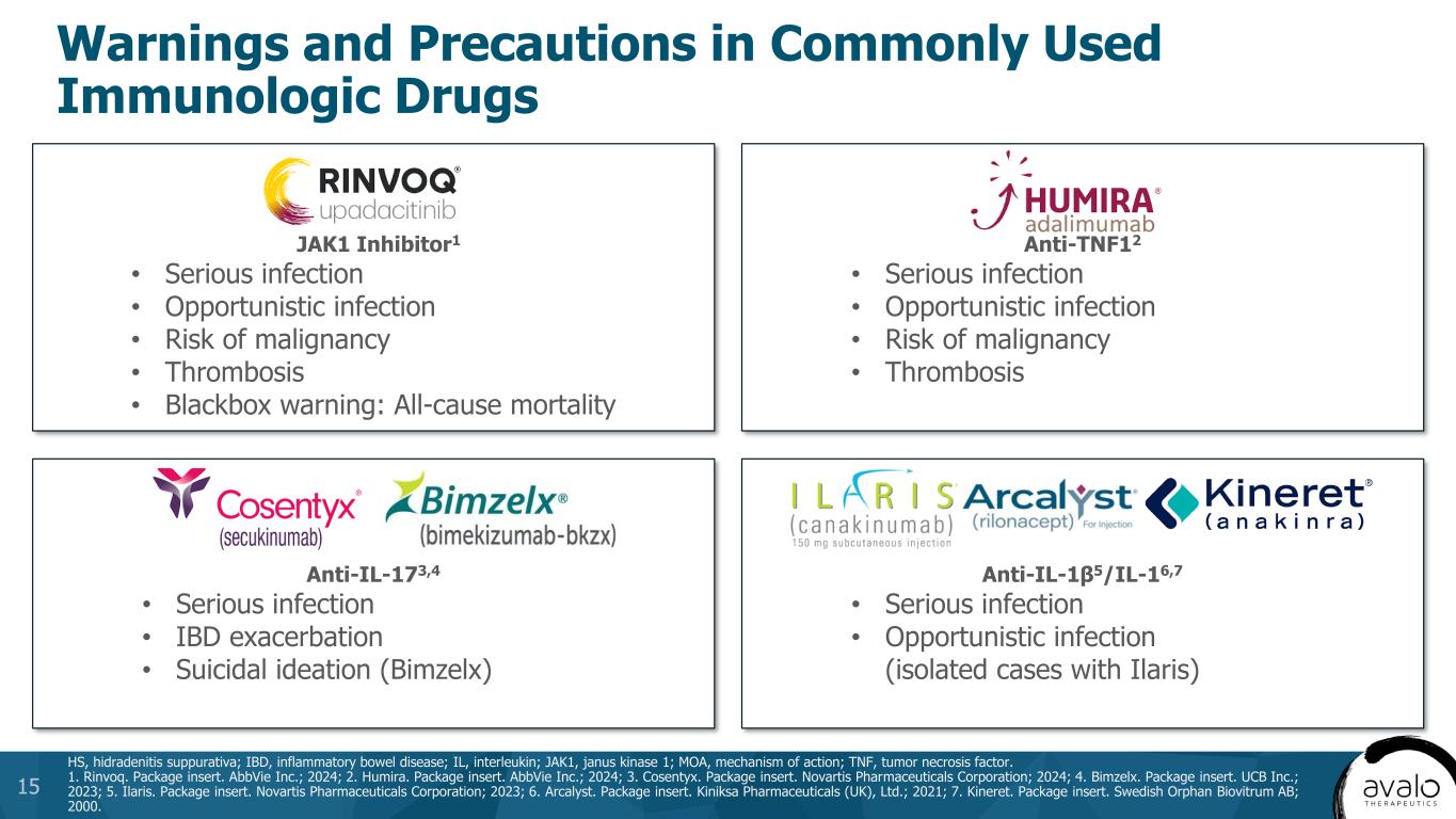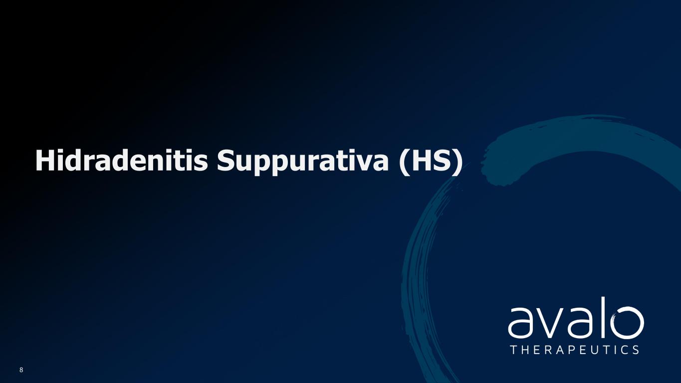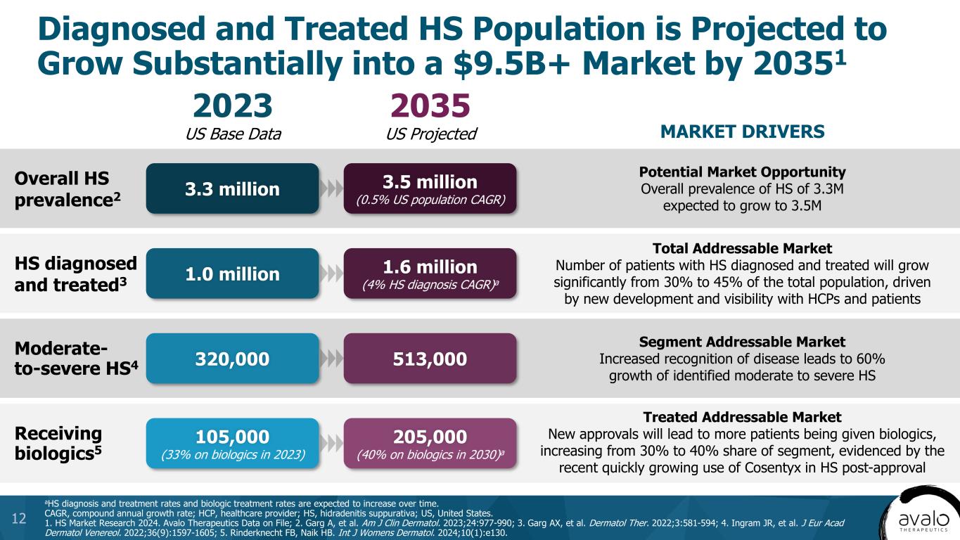 Overall HS prevalence2 HS diagnosed and treated3 Moderate- to-severe HS4 Receiving biologics5 Diagnosed and Treated HS Population is Projected to Grow Substantially into a $9.5B+ Market by 20351 aHS diagnosis and treatment rates and biologic treatment rates are expected to increase over time. CAGR, compound annual growth rate; HCP, healthcare provider; HS, hidradenitis suppurativa; US, United States. 1. HS Market Research 2024. Avalo Therapeutics Data on File; 2. Garg A, et al. Am J Clin Dermatol. 2023;24:977-990; 3. Garg AX, et al. Dermatol Ther. 2022;3:581-594; 4. Ingram JR, et al. J Eur Acad Dermatol Venereol. 2022;36(9):1597-1605; 5. Rinderknecht FB, Naik HB. Int J Womens Dermatol. 2024;10(1):e130. 12 2023 US Base Data 2035 US Projected Potential Market Opportunity Overall prevalence of HS of 3.3M expected to grow to 3.5M Total Addressable Market Number of patients with HS diagnosed and treated will grow significantly from 30% to 45% of the total population, driven by new development and visibility with HCPs and patients Segment Addressable Market Increased recognition of disease leads to 60% growth of identified moderate to severe HS Treated Addressable Market New approvals will lead to more patients being given biologics, increasing from 30% to 40% share of segment, evidenced by the recent quickly growing use of Cosentyx in HS post-approval MARKET DRIVERS 3.3 million 3.5 million (0.5% US population CAGR) 1.0 million 1.6 million (4% HS diagnosis CAGR)a 320,000 513,000 205,000 (40% on biologics in 2030)a 105,000 (33% on biologics in 2023)