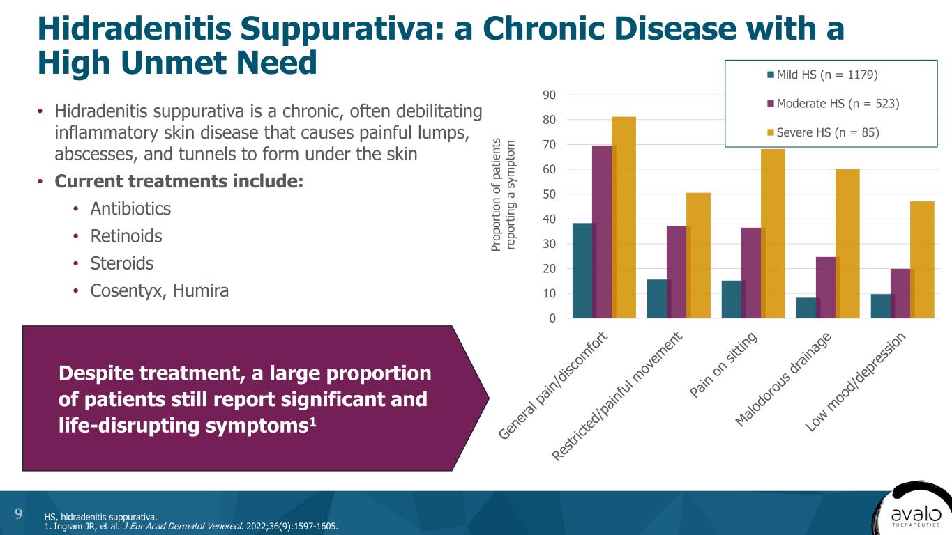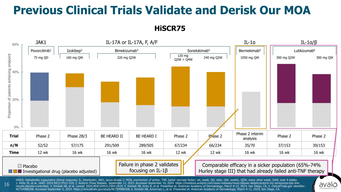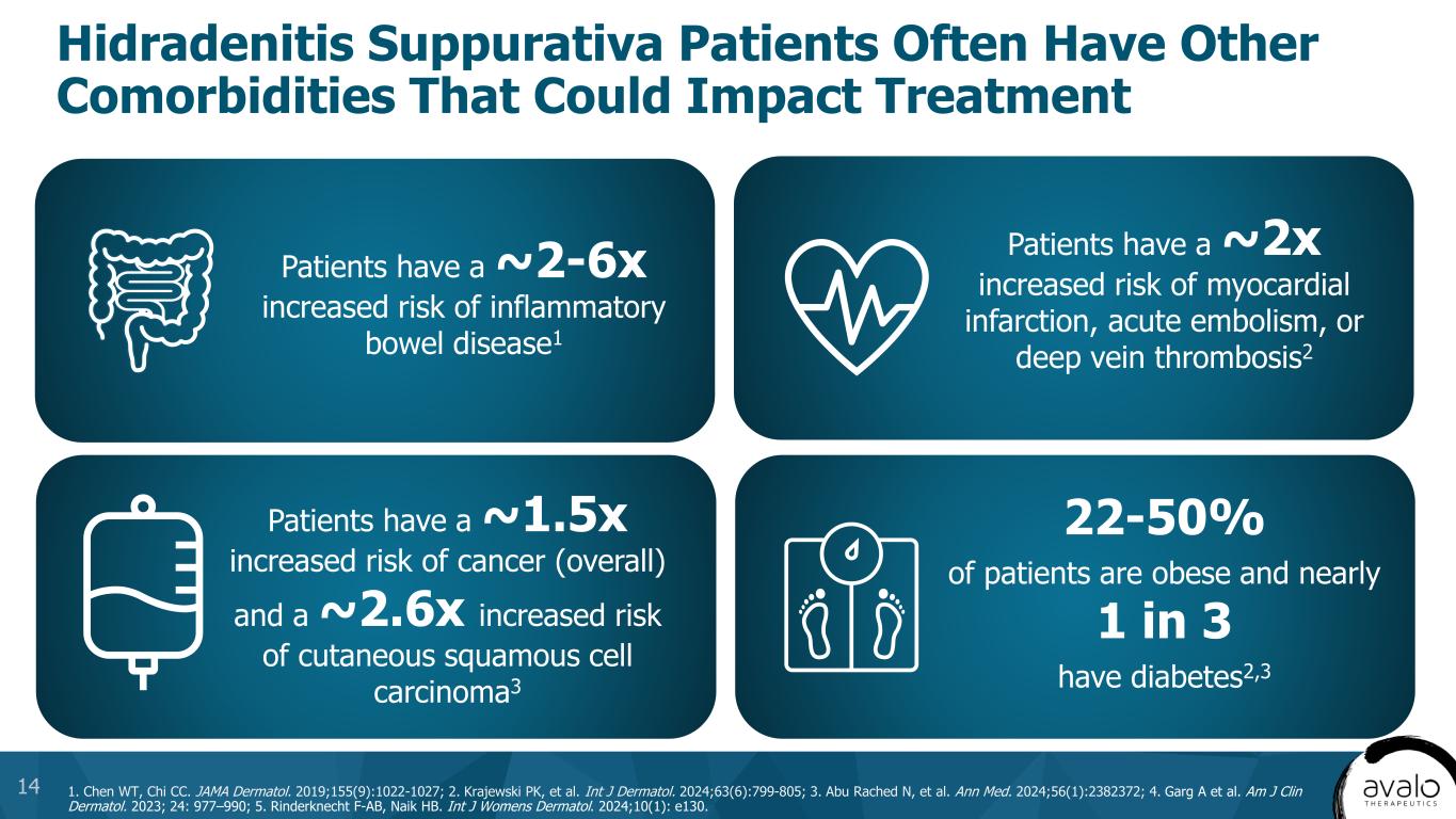 Overall HS prevalence2 HS diagnosed and treated3 Moderate- to-severe HS4 Receiving biologics5 Diagnosed and Treated HS Population is Projected to Grow Substantially into a $9.5B+ Market by 20351 aHS diagnosis and treatment rates and biologic treatment rates are expected to increase over time. CAGR, compound annual growth rate; HCP, healthcare provider; HS, hidradenitis suppurativa; US, United States. 1. HS Market Research 2024. Avalo Therapeutics Data on File; 2. Garg A, et al. Am J Clin Dermatol. 2023;24:977-990; 3. Garg AX, et al. Dermatol Ther. 2022;3:581-594; 4. Ingram JR, et al. J Eur Acad Dermatol Venereol. 2022;36(9):1597-1605; 5. Rinderknecht FB, Naik HB. Int J Womens Dermatol. 2024;10(1):e130. 12 2023 US Base Data 2035 US Projected Potential Market Opportunity Overall prevalence of HS of 3.3M expected to grow to 3.5M Total Addressable Market Number of patients with HS diagnosed and treated will grow significantly from 30% to 45% of the total population, driven by new development and visibility with HCPs and patients Segment Addressable Market Increased recognition of disease leads to 60% growth of identified moderate to severe HS Treated Addressable Market New approvals will lead to more patients being given biologics, increasing from 30% to 40% share of segment, evidenced by the recent quickly growing use of Cosentyx in HS post-approval MARKET DRIVERS 3.3 million 3.5 million (0.5% US population CAGR) 1.0 million 1.6 million (4% HS diagnosis CAGR)a 320,000 513,000 205,000 (40% on biologics in 2030)a 105,000 (33% on biologics in 2023)