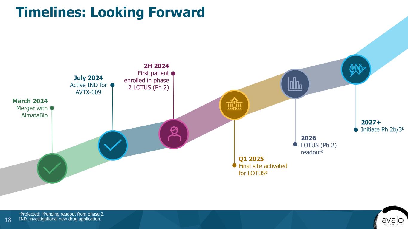 Key Secondary Endpoints: • TEAEs • HiSCR50, HiSCR90 • International HS Severity Score System (IHS4) • AN count, draining fistula count • Patient’s Global Assessment of Skin Pain (PGA Skin Pain) (NRS30) • Percentage of subjects with flares • ADA Exploratory Endpoints: • PK • HiSQOL, DLQI, PHQ-9 • Biomarkers: • CRP • IL-6 • Potentially other biomarkers • HS for at least 6 months prior to baseline • Total AN count of ≥5 at baseline • HS lesions must be present in at least 2 distinct anatomic areas • At least one HS lesion that is Hurley stage II or III • Enrollment of patients who have not failed anti-TNF therapy (naive or exposed) will be capped at 40% Primary Endpoint: Percentage of participants achieving HiSCR75 at 16 weeks Key Secondary/Exploratory Endpoints Efficacy and Safety of AVTX-009 Treatment in Participants With Hidradenitis Suppurativa Key Inclusion Criteria Primary Study Endpoint AVTX-009 loading dose 600 mg then 300 mg SC Q4W AVTX-009 loading dose 300 mg then 150 mg SC Q2W Placebo 6-week safety follow-up 0 2 4 8 10 12 14 P re -s c re e n in g : d a y – 2 8 t o d a y – 7 EOT (week 16) EOS (week 20) Week 6 16 Phase 2 LOTUS Trial in Hidradenitis Suppurativa (AVTX-009-HS-201, NCT06603077) R 1:1:1 N = ~180a aTrial has 80% power to show a HiSCR75 response for each individual arm (based on lutikizumab phase 2 HiSCR75). ADA, antidrug antibody; AN, abscess and inflammatory nodule; CRP, C-reactive protein; DLQI, dermatology life quality index; EOS, end of study; EOT, end of treatment; HiSCR, Hidradenitis Suppurativa Clinical Response; HiSQOL, hidradenitis suppurativa quality of life; HS, hidradenitis suppurativa; NRS30, numerical rating scale 30; PHQ-9, patient health questionnaire-9; PK, pharmacokinetics; Q2W, every 2 weeks; Q4W, every 4 weeks; R, randomize; SC, subcutaneous; TEAE, treatment emergent adverse event; TNF, tumor necrosis factor. 17