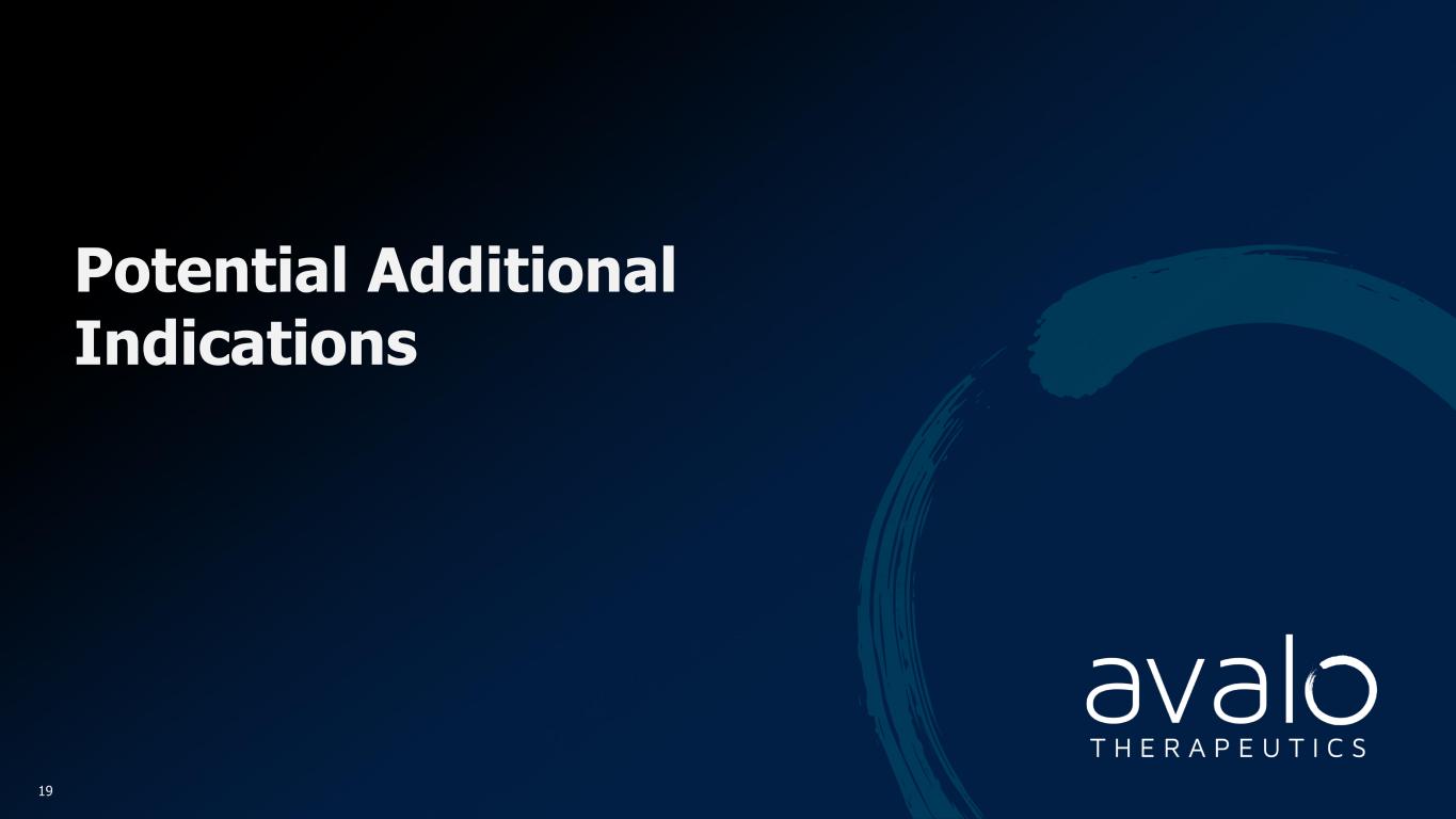 Timelines: Looking Forward aProjected; bPending readout from phase 2. IND, investigational new drug application. 18 2026 LOTUS (Ph 2) readouta 2027+ Initiate Ph 2b/3b Q1 2025 Final site activated for LOTUSa 2H 2024 First patient enrolled in phase 2 LOTUS (Ph 2) March 2024 Merger with AlmataBio July 2024 Active IND for AVTX-009