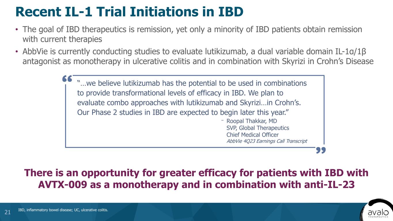 Role of IL-1β in IBD • IL-1β plays a central role in inflammation in IBD1 – IL-1β is a key cytokine produced upon inflammasome activation – Dysregulated inflammasome activation has been implicated in the pathogenesis of Crohn’s disease • IL-1–driven stromal–neutrophil interactions define a subset of patients who do not respond to current therapies2,3 • There is an observed overlap of patients that have IBD and HS4,5 HS, hidradenitis suppurativa; IBD, inflammatory bowel disease. 1. Mao L, et al. Front Immunol. 2018;9:2566; 2. Friedrich M, et al. Nat Med. 2021;27(11):1970-1981; 3. Cader MZ, Kaser A. Nat Med. 2021;27(11):1870-1871; 4. Chen WT, Chi CC. JAMA Dermatol. 2019;155(9):1022-1027; 5. Zhang M, et al. World J Clin Cases. 2021;9(15):3506-3516. 20