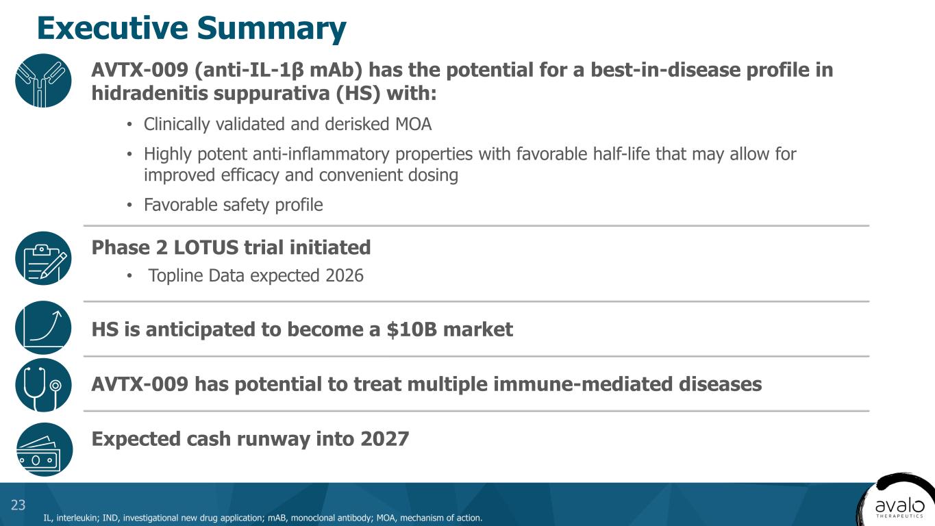 Executive Summary IL, interleukin; IND, investigational new drug application; mAB, monoclonal antibody; MOA, mechanism of action. 23 AVTX-009 (anti-IL-1β mAb) has the potential for a best-in-disease profile in hidradenitis suppurativa (HS) with: • Clinically validated and derisked MOA • Highly potent anti-inflammatory properties with favorable half-life that may allow for improved efficacy and convenient dosing • Favorable safety profile Expected cash runway into 2027 AVTX-009 has potential to treat multiple immune-mediated diseases HS is anticipated to become a $10B market Phase 2 LOTUS trial initiated • Topline Data expected 2026