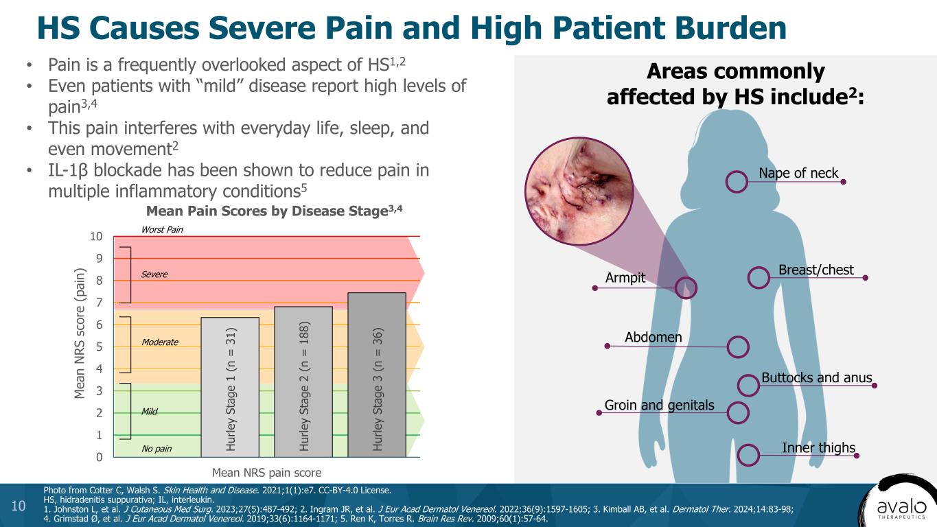 HS Causes Severe Pain and High Patient Burden Photo from Cotter C, Walsh S. Skin Health and Disease. 2021;1(1):e7. CC-BY-4.0 License. HS, hidradenitis suppurativa; IL, interleukin. 1. Johnston L, et al. J Cutaneous Med Surg. 2023;27(5):487-492; 2. Ingram JR, et al. J Eur Acad Dermatol Venereol. 2022;36(9):1597-1605; 3. Kimball AB, et al. Dermatol Ther. 2024;14:83-98; 4. Grimstad Ø, et al. J Eur Acad Dermatol Venereol. 2019;33(6):1164-1171; 5. Ren K, Torres R. Brain Res Rev. 2009;60(1):57-64. 10 Hu rle y St ag e 1 (n = 3 1) Hu rle y St ag e 2 (n = 1 88 ) Hu rle y St ag e 3 (n = 3 6) 0 1 2 3 4 5 6 7 8 9 10 Mean NRS pain score M ea n NR S sc or e (p ai n) No pain Mild Moderate Severe Worst Pain Mean Pain Scores by Disease Stage3,4 Nape of neck Breast/chest Buttocks and anus Inner thighs Groin and genitals Abdomen Armpit Areas commonly affected by HS include2: • Pain is a frequently overlooked aspect of HS1,2 • Even patients with “mild” disease report high levels of pain3,4 • This pain interferes with everyday life, sleep, and even movement2 • IL-1β blockade has been shown to reduce pain in multiple inflammatory conditions5