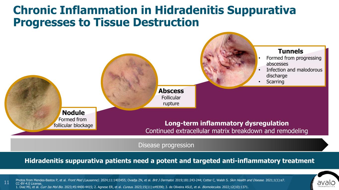Key Secondary Endpoints: • TEAEs • HiSCR50, HiSCR90 • International HS Severity Score System (IHS4) • AN count, draining fistula count • Patient’s Global Assessment of Skin Pain (PGA Skin Pain) (NRS30) • Percentage of subjects with flares • ADA Exploratory Endpoints: • PK • HiSQOL, DLQI, PHQ-9 • Biomarkers: • CRP • IL-6 • Potentially other biomarkers • HS for at least 6 months prior to baseline • Total AN count of ≥5 at baseline • HS lesions must be present in at least 2 distinct anatomic areas • At least one HS lesion that is Hurley stage II or III • Enrollment of patients who have not failed anti-TNF therapy (naive or exposed) will be capped at 40% Primary Endpoint: Percentage of participants achieving HiSCR75 at 16 weeks Key Secondary/Exploratory Endpoints Efficacy and Safety of AVTX-009 Treatment in Participants With Hidradenitis Suppurativa Key Inclusion Criteria Primary Study Endpoint AVTX-009 loading dose 600 mg then 300 mg SC Q4W AVTX-009 loading dose 300 mg then 150 mg SC Q2W Placebo 6-week safety follow-up 0 2 4 8 10 12 14 Pr e- sc re en in g: da y –2 8 to d ay – 7 EOT (week 16) EOS (week 20) Week 6 16 Phase 2 LOTUS Trial in Hidradenitis Suppurativa (AVTX-009-HS-201, NCT06603077) R 1:1:1 N = ~180a aTrial has 80% power to show a HiSCR75 response for each individual arm (based on lutikizumab phase 2 HiSCR75). ADA, antidrug antibody; AN, abscess and inflammatory nodule; CRP, C-reactive protein; DLQI, dermatology life quality index; EOS, end of study; EOT, end of treatment; HiSCR, Hidradenitis Suppurativa Clinical Response; HiSQOL, hidradenitis suppurativa quality of life; HS, hidradenitis suppurativa; NRS30, numerical rating scale 30; PHQ-9, patient health questionnaire-9; PK, pharmacokinetics; Q2W, every 2 weeks; Q4W, every 4 weeks; R, randomize; SC, subcutaneous; TEAE, treatment emergent adverse event; TNF, tumor necrosis factor. 17
