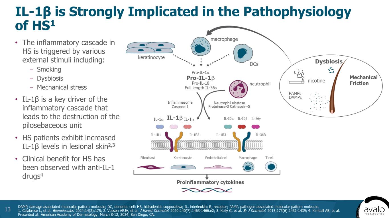 IL-1β is Strongly Implicated in the Pathophysiology of HS1 • The inflammatory cascade in HS is triggered by various external stimuli including: – Smoking – Dysbiosis – Mechanical stress • IL-1β is a key driver of the inflammatory cascade that leads to the destruction of the pilosebaceous unit • HS patients exhibit increased IL-1β levels in lesional skin2,3 • Clinical benefit for HS has been observed with anti-IL-1 drugs4 DAMP, damage-associated molecular pattern molecule; DC, dendritic cell; HS, hidradenitis suppurativa; IL, interleukin; R, receptor; PAMP, pathogen-associated molecular pattern molecule. 1. 2. ; 3. 4. Kimball AB, et al. Presented at: American Academy of Dermatology; March 8-12, 2024; San Diego, CA. Calabrese L, et al. Biomolecules. 2024;14(2):175; Vossen ARJV, et al. J Invest Dermatol. 2020;140(7):1463-1466.e2 Kelly G, et al. Br J Dermatol. 2015;173(6):1431-1439; 13