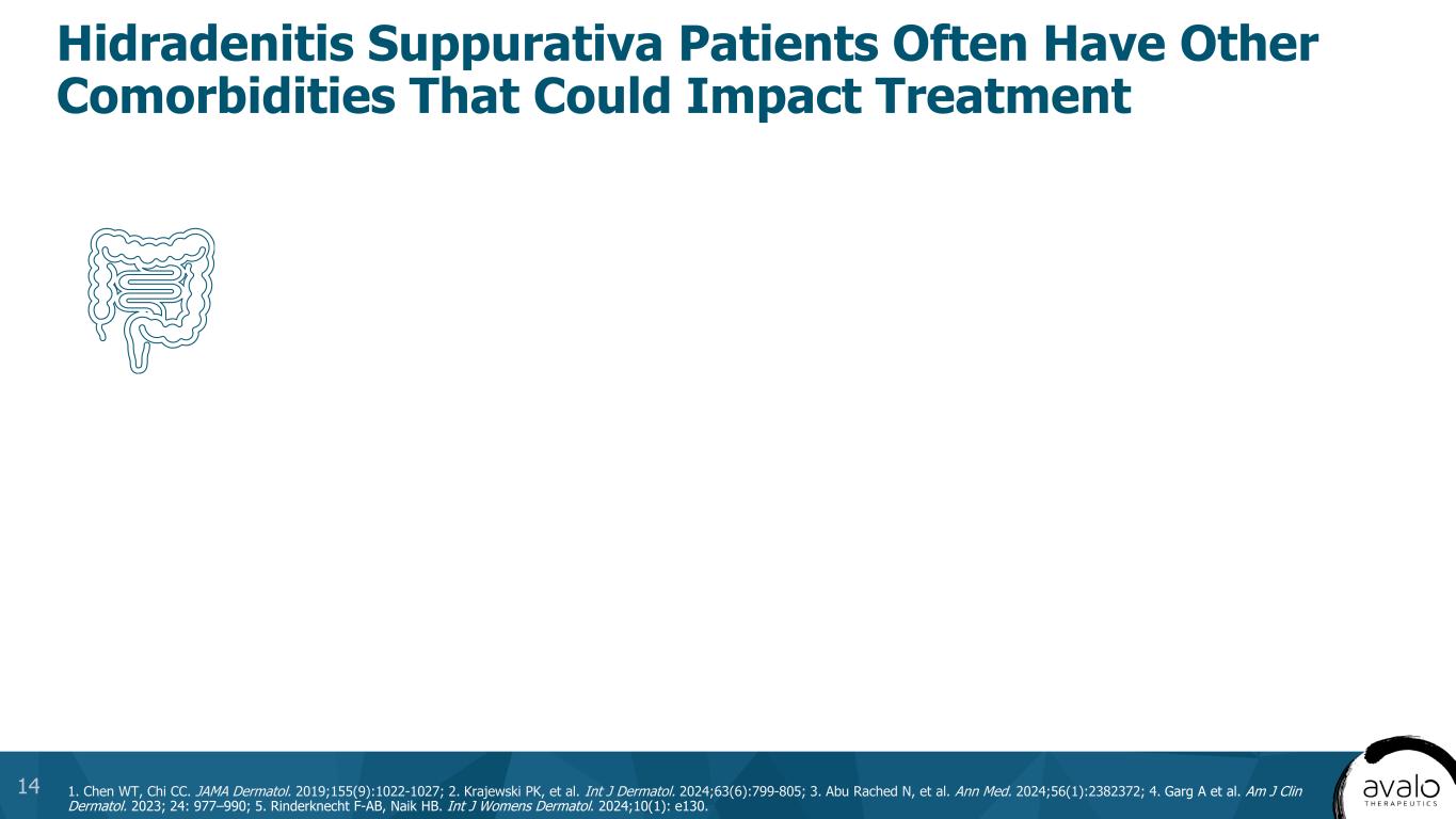 Overall HS prevalence2 HS diagnosed and treated3 Moderate- to-severe HS4 Receiving biologics5 Diagnosed and Treated HS Population is Projected to Grow Substantially into a $9.5B+ Market by 20351 aHS diagnosis and treatment rates and biologic treatment rates are expected to increase over time. CAGR, compound annual growth rate; HCP, healthcare provider; HS, hidradenitis suppurativa; US, United States. 1. HS Market Research 2024. Avalo Therapeutics Data on File; 2. Garg A, et al. Am J Clin Dermatol. 2023;24:977-990; 3. Garg AX, et al. Dermatol Ther. 2022;3:581-594; 4. Ingram JR, et al. J Eur Acad Dermatol Venereol. 2022;36(9):1597-1605; 5. Rinderknecht FB, Naik HB. Int J Womens Dermatol. 2024;10(1):e130. 12 2023 US Base Data 2035 US Projected Potential Market Opportunity Overall prevalence of HS of 3.3M expected to grow to 3.5M Total Addressable Market Number of patients with HS diagnosed and treated will grow significantly from 30% to 45% of the total population, driven by new development and visibility with HCPs and patients Segment Addressable Market Increased recognition of disease leads to 60% growth of identified moderate to severe HS Treated Addressable Market New approvals will lead to more patients being given biologics, increasing from 30% to 40% share of segment, evidenced by the recent quickly growing use of Cosentyx in HS post-approval MARKET DRIVERS 3.3 million 3.5 million (0.5% US population CAGR) 1.0 million 1.6 million (4% HS diagnosis CAGR)a 320,000 513,000 205,000 (40% on biologics in 2030)a 105,000 (33% on biologics in 2023)