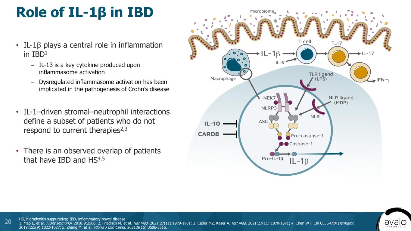Role of IL-1β in IBD • IL-1β plays a central role in inflammation in IBD1 – IL-1β is a key cytokine produced upon inflammasome activation – Dysregulated inflammasome activation has been implicated in the pathogenesis of Crohn’s disease • IL-1–driven stromal–neutrophil interactions define a subset of patients who do not respond to current therapies2,3 • There is an observed overlap of patients that have IBD and HS4,5 HS, hidradenitis suppurativa; IBD, inflammatory bowel disease. 1. Mao L, et al. Front Immunol. 2018;9:2566; 2. Friedrich M, et al. Nat Med. 2021;27(11):1970-1981; 3. Cader MZ, Kaser A. Nat Med. 2021;27(11):1870-1871; 4. Chen WT, Chi CC. JAMA Dermatol. 2019;155(9):1022-1027; 5. Zhang M, et al. World J Clin Cases. 2021;9(15):3506-3516. 20