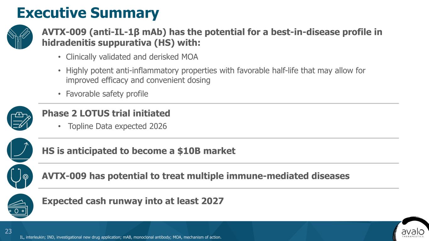 Executive Summary IL, interleukin; IND, investigational new drug application; mAB, monoclonal antibody; MOA, mechanism of action. 3 AVTX-009 (anti-IL-1β mAb) has the potential for a best-in-disease profile in hidradenitis suppurativa (HS) with: • Clinically validated and derisked MOA • Highly potent anti-inflammatory properties with favorable half-life that may allow for improved efficacy and convenient dosing • Favorable safety profile Expected cash runway into at least 2027 AVTX-009 has the potential to treat multiple immune-mediated diseases HS is anticipated to become a $10B market Phase 2 LOTUS trial initiated • Topline Data expected 2026