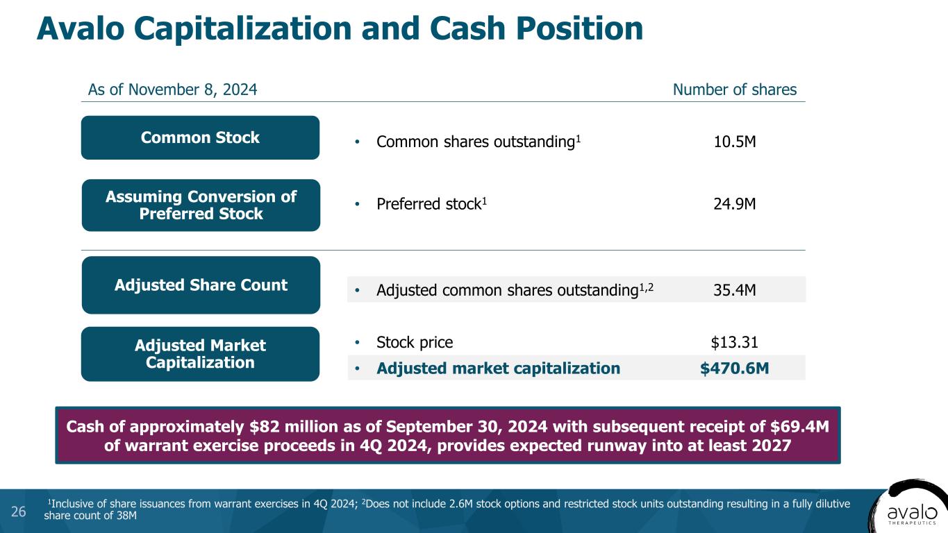 Avalo Capitalization and Cash Position 1Inclusive of share issuances from warrant exercises in 4Q 2024; 2Does not include 2.6M stock options and restricted stock units outstanding resulting in a fully dilutive share count of 38M26 As of November 8, 2024 Number of shares • Common shares outstanding1 10.5M • Preferred stock1 24.9M • Adjusted common shares outstanding1,2 35.4M • Stock price $13.31 • Adjusted market capitalization $470.6M Common Stock Assuming Conversion of Preferred Stock Adjusted Share Count Adjusted Market Capitalization Cash of approximately $82 million as of September 30, 2024 with subsequent receipt of $69.4M of warrant exercise proceeds in 4Q 2024, provides expected runway into at least 2027