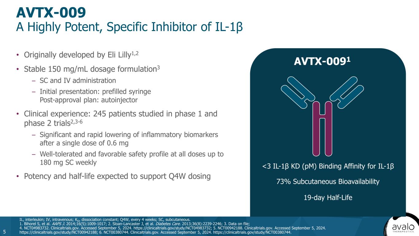 A proven track record of successful leadership, product development, and commercialization in pharma and biotech Avalo Management Team 175+ Years of Experience in Biotech/Pharma 4 Lisa Hegg, PhD SVP, Program Management, Corporate Infrastructure, Clinical Operations Colleen Matkowski SVP, Global Regulatory Affairs, Quality Assurance Dino C. Miano, PhD SVP, CMC, Technical Operations Chris Sullivan Chief Financial Officer Mittie Doyle, MD Chief Medical Officer Paul Varki Chief Legal Officer Garry A. Neil, MD Chief Executive Officer Chairman of the Board