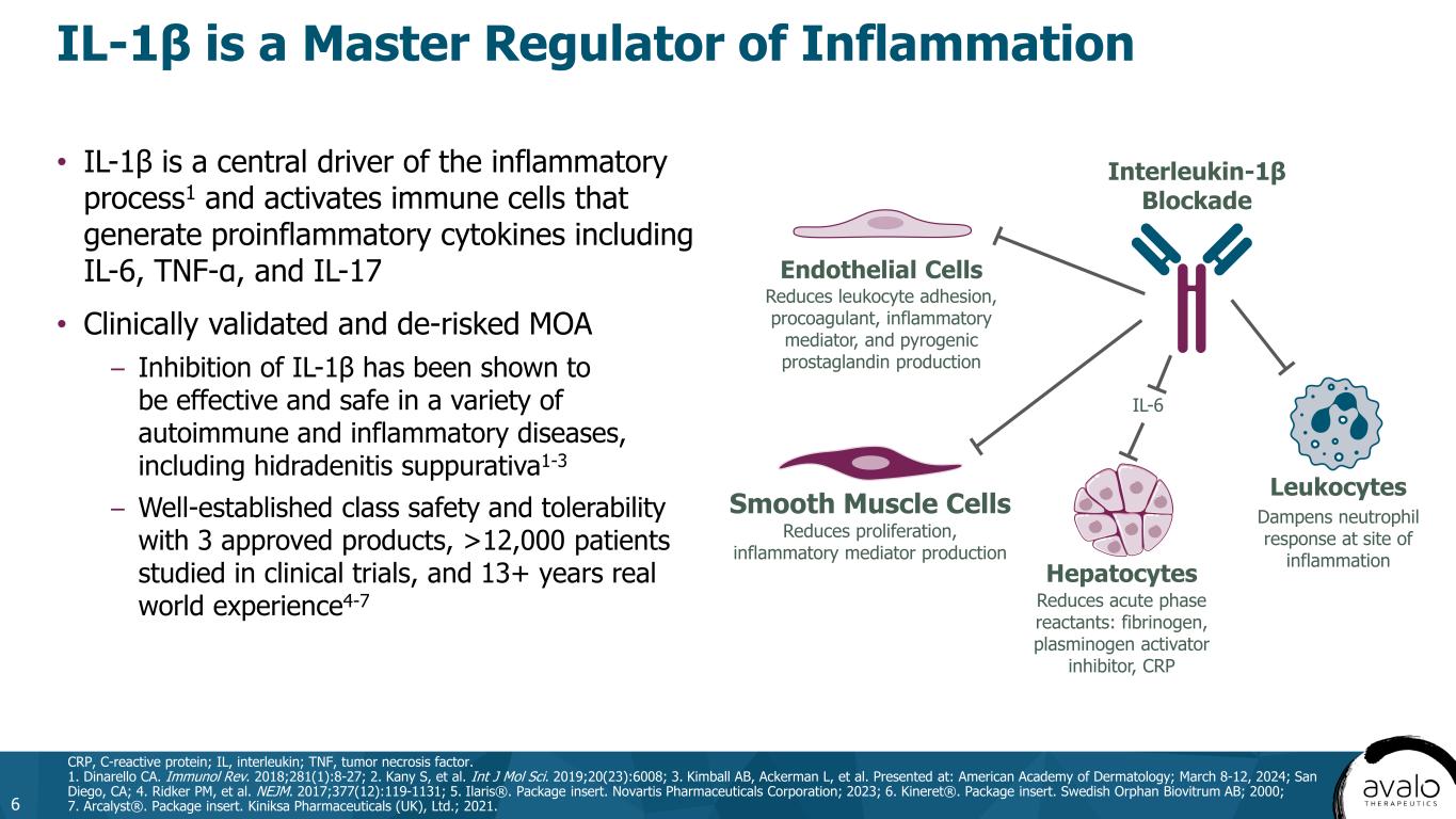 AVTX-009 A Highly Potent, Specific Inhibitor of IL-1β 5 • Originally developed by Eli Lilly1,2 • Stable 150 mg/mL dosage formulation3 – SC and IV administration – Initial presentation: prefilled syringe Post-approval plan: autoinjector • Clinical experience: 245 patients studied in phase 1 and phase 2 trials2,3-6 – Significant and rapid lowering of inflammatory biomarkers after a single dose of 0.6 mg – Well-tolerated and favorable safety profile at all doses up to 180 mg SC weekly • Potency and half-life expected to support Q4W dosing IL, interleukin; IV, intravenous; KD, dissociation constant; Q4W, every 4 weeks; SC, subcutaneous. 1. Bihorel S, et al. AAPS J. 2014;16(5):1009-1017; 2. Sloan-Lancaster J, et al. Diabetes Care. 2013;36(8):2239-2246; 3. Data on file; 4. NCT04983732. Clinicaltrials.gov. Accessed September 5, 2024. https://clinicaltrials.gov/study/NCT04983732; 5. NCT00942188. Clinicaltrials.gov. Accessed September 5, 2024. https://clinicaltrials.gov/study/NCT00942188; 6. NCT00380744. Clinicaltrials.gov. Accessed September 5, 2024. https://clinicaltrials.gov/study/NCT00380744. AVTX-0091 <3 IL-1β KD (pM) Binding Affinity for IL-1β 73% Subcutaneous Bioavailability 19-day Half-Life