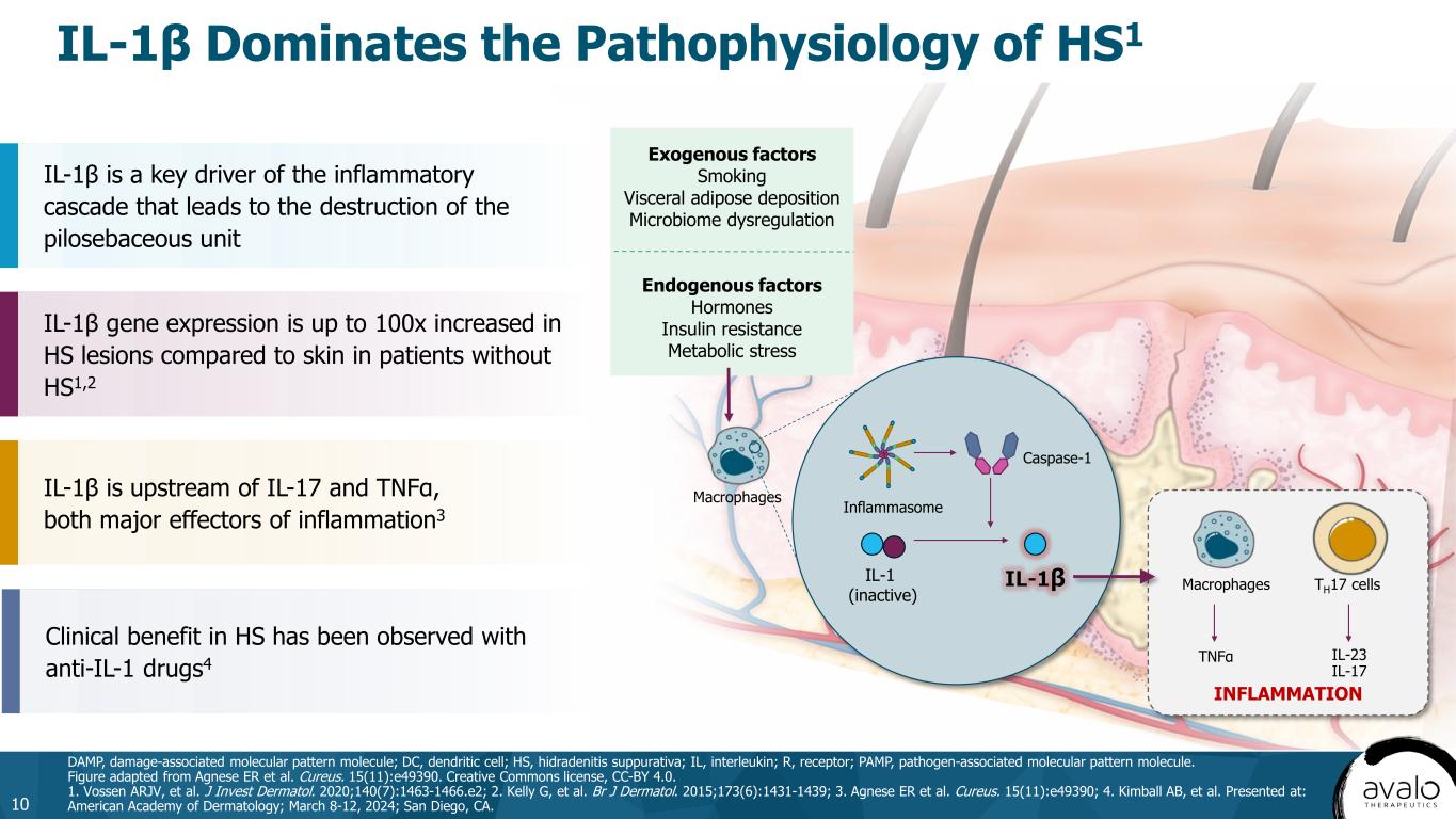IL-1β Dominates the Pathophysiology of HS1 10 DAMP, damage-associated molecular pattern molecule; DC, dendritic cell; HS, hidradenitis suppurativa; IL, interleukin; R, receptor; PAMP, pathogen-associated molecular pattern molecule. Figure adapted from Agnese ER et al. Cureus. 15(11):e49390. Creative Commons license, CC-BY 4.0. 1. Vossen ARJV, et al. J Invest Dermatol. 2020;140(7):1463-1466.e2; 2. Kelly G, et al. Br J Dermatol. 2015;173(6):1431-1439; 3. Agnese ER et al. Cureus. 15(11):e49390; 4. Kimball AB, et al. Presented at: American Academy of Dermatology; March 8-12, 2024; San Diego, CA. Macrophages Inflammasome Caspase-1 INFLAMMATION Macrophages TH17 cells IL-23 IL-17 TNFα IL-1 (inactive) Exogenous factors Smoking Visceral adipose deposition Microbiome dysregulation Endogenous factors Hormones Insulin resistance Metabolic stress IL-1β is a key driver of the inflammatory cascade that leads to the destruction of the pilosebaceous unit IL-1β gene expression is up to 100x increased in HS lesions compared to skin in patients without HS1,2 IL-1β is upstream of IL-17 and TNFα, both major effectors of inflammation3 Clinical benefit in HS has been observed with anti-IL-1 drugs4