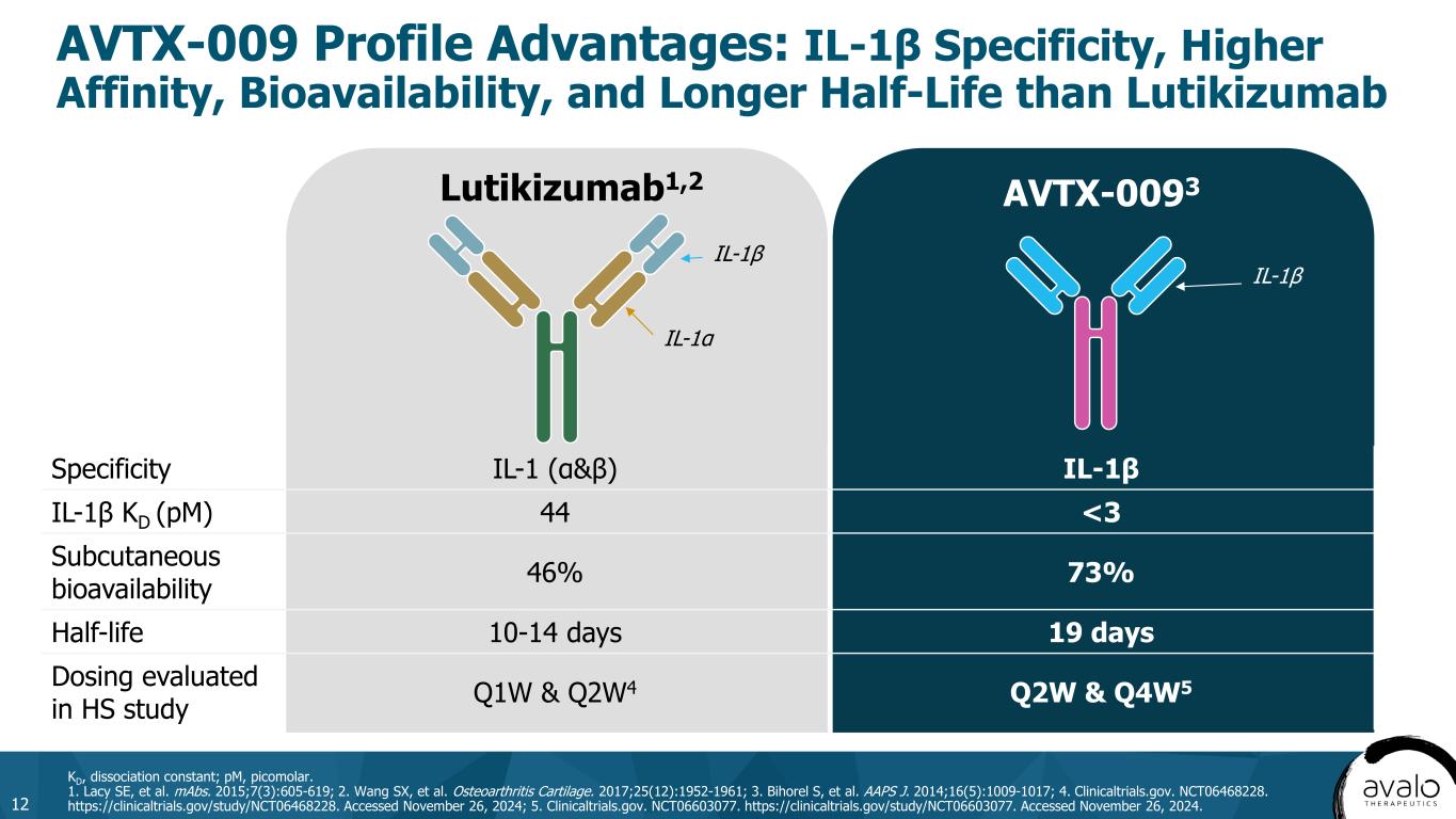 AVTX-009 Profile Advantages: IL-1β Specificity, Higher Affinity, Bioavailability, and Longer Half-Life than Lutikizumab 12 KD, dissociation constant; pM, picomolar. 1. Lacy SE, et al. mAbs. 2015;7(3):605-619; 2. Wang SX, et al. Osteoarthritis Cartilage. 2017;25(12):1952-1961; 3. Bihorel S, et al. AAPS J. 2014;16(5):1009-1017; 4. Clinicaltrials.gov. NCT06468228. https://clinicaltrials.gov/study/NCT06468228. Accessed November 26, 2024; 5. Clinicaltrials.gov. NCT06603077. https://clinicaltrials.gov/study/NCT06603077. Accessed November 26, 2024. Specificity IL-1 (α&β) IL-1β IL-1β KD (pM) 44 <3 Subcutaneous bioavailability 46% 73% Half-life 10-14 days 19 days Dosing evaluated in HS study Q1W & Q2W4 Q2W & Q4W5 Lutikizumab1,2 AVTX-0093 IL-1β IL-1β IL-1α