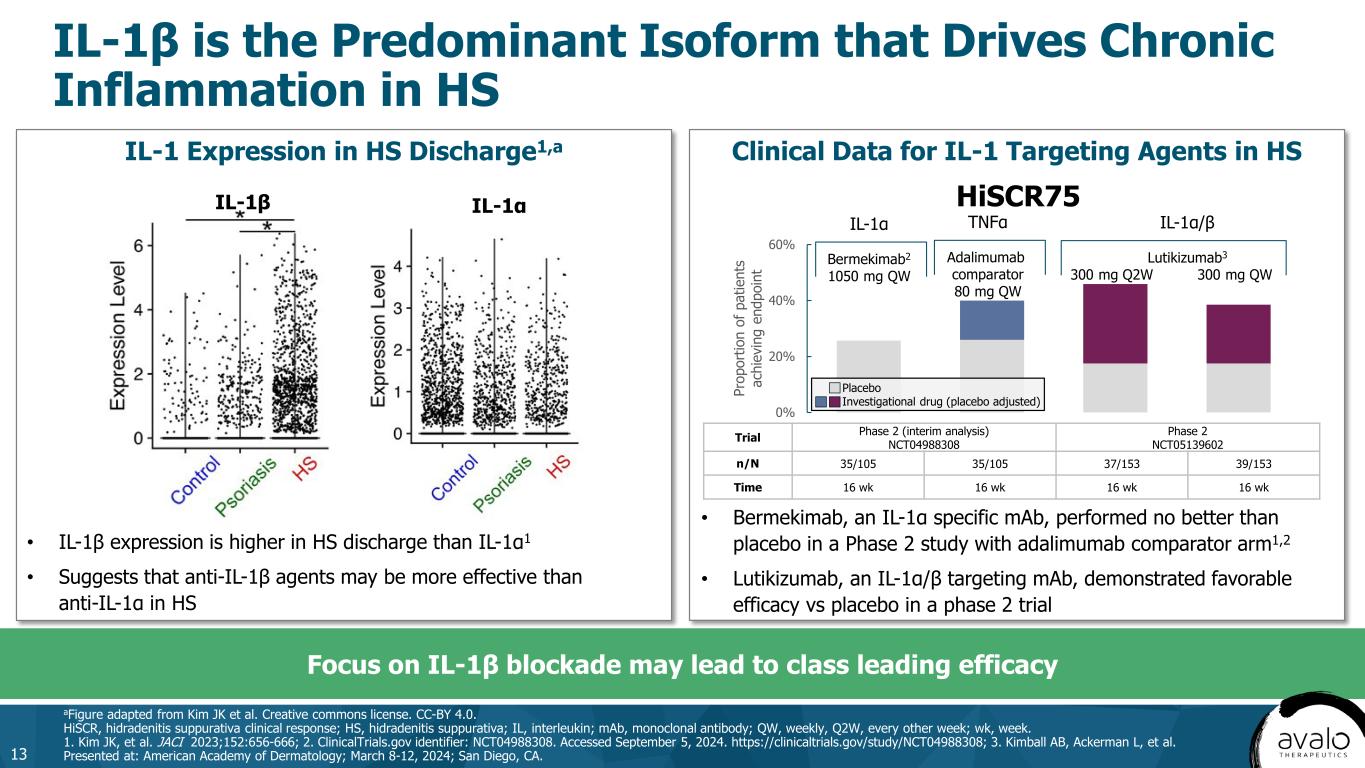 IL-1β is the Predominant Isoform that Drives Chronic Inflammation in HS 13 aFigure adapted from Kim JK et al. Creative commons license. CC-BY 4.0. HiSCR, hidradenitis suppurativa clinical response; HS, hidradenitis suppurativa; IL, interleukin; mAb, monoclonal antibody; QW, weekly, Q2W, every other week; wk, week. 1. Kim JK, et al. JACI 2023;152:656-666; 2. ClinicalTrials.gov identifier: NCT04988308. Accessed September 5, 2024. https://clinicaltrials.gov/study/NCT04988308; 3. Kimball AB, Ackerman L, et al. Presented at: American Academy of Dermatology; March 8-12, 2024; San Diego, CA. IL-1 Expression in HS Discharge1,a Focus on IL-1β blockade may lead to class leading efficacy • IL-1β expression is higher in HS discharge than IL-1α1 • Suggests that anti-IL-1β agents may be more effective than anti-IL-1α in HS Trial Phase 2 (interim analysis) NCT04988308 Phase 2 NCT05139602 n/N 35/105 35/105 37/153 39/153 Time 16 wk 16 wk 16 wk 16 wk Clinical Data for IL-1 Targeting Agents in HS 0% 20% 40% 60% Pr op or tio n of p at ie nt s ac hi ev in g en dp oi nt HiSCR75 IL-1α Bermekimab2 1050 mg QW IL-1α/β Lutikizumab3 300 mg Q2W 300 mg QW Placebo Investigational drug (placebo adjusted) TNFα Adalimumab comparator 80 mg QW IL-1β IL-1α • Bermekimab, an IL-1α specific mAb, performed no better than placebo in a Phase 2 study with adalimumab comparator arm1,2 • Lutikizumab, an IL-1α/β targeting mAb, demonstrated favorable efficacy vs placebo in a phase 2 trial