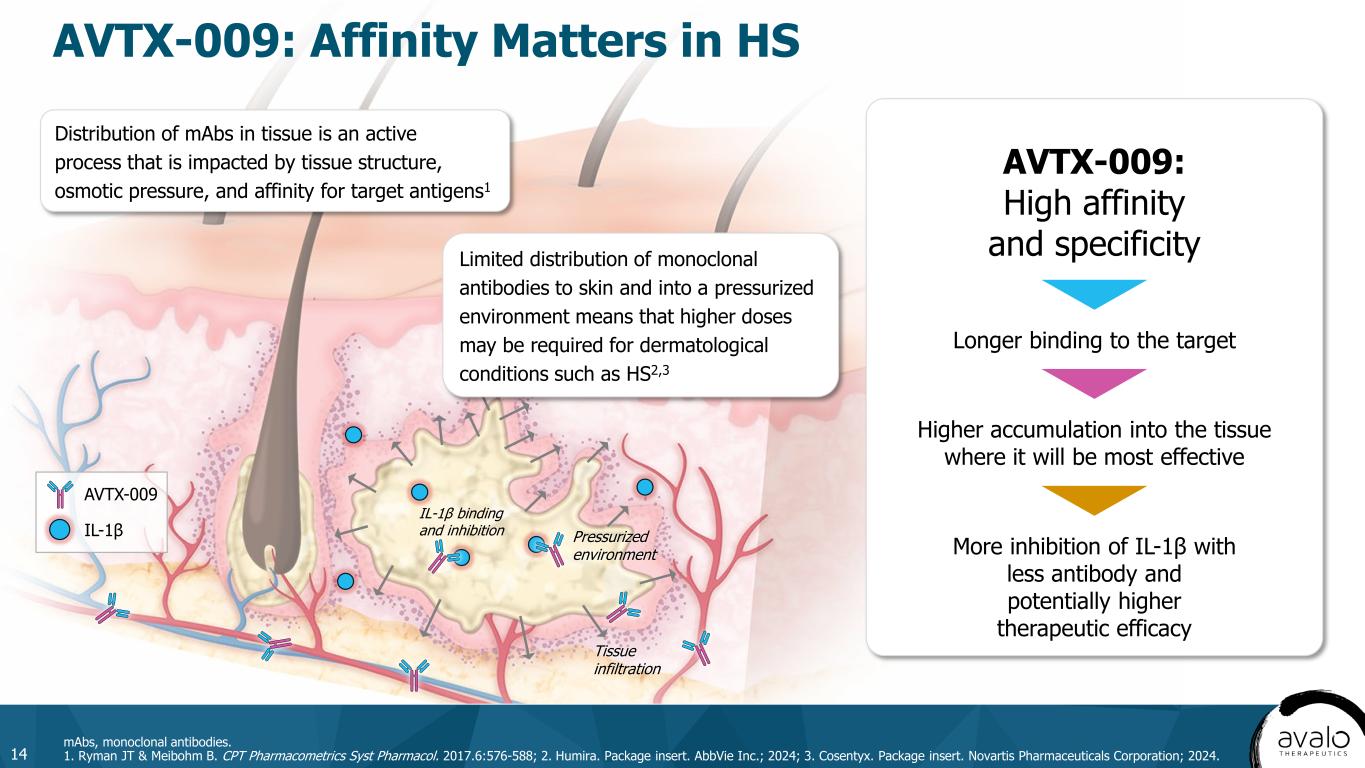 Pressurized environment Tissue infiltration IL-1β binding and inhibition AVTX-009: Affinity Matters in HS 14 mAbs, monoclonal antibodies. 1. Ryman JT & Meibohm B. CPT Pharmacometrics Syst Pharmacol. 2017.6:576-588; 2. Humira. Package insert. AbbVie Inc.; 2024; 3. Cosentyx. Package insert. Novartis Pharmaceuticals Corporation; 2024. Distribution of mAbs in tissue is an active process that is impacted by tissue structure, osmotic pressure, and affinity for target antigens1 IL-1β AVTX-009 AVTX-009: High affinity and specificity More inhibition of IL-1β with less antibody and potentially higher therapeutic efficacy Longer binding to the target Higher accumulation into the tissue where it will be most effective Limited distribution of monoclonal antibodies to skin and into a pressurized environment means that higher doses may be required for dermatological conditions such as HS2,3