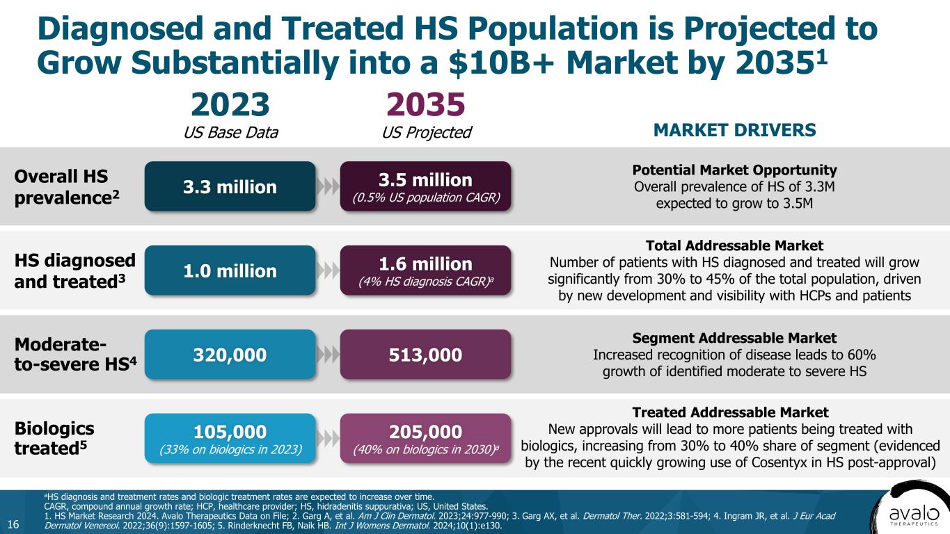Key Secondary Endpoints: • TEAEs • HiSCR50, HiSCR90 • International HS Severity Score System (IHS4) • AN count, draining fistula count • Patient’s Global Assessment of Skin Pain (PGA Skin Pain) (NRS30) • Percentage of subjects with flares • ADA Exploratory Endpoints: • PK • HiSQOL, DLQI, PHQ-9 • Biomarkers: • CRP • IL-6 • Potentially other biomarkers • HS for at least 6 months prior to baseline • Total AN count of ≥5 at baseline • HS lesions must be present in at least 2 distinct anatomic areas • At least one HS lesion that is Hurley stage II or III • Enrollment of patients who have not failed anti-TNF therapy (naive or exposed) will be capped at 40% Primary Endpoint: Percentage of participants achieving HiSCR75 at 16 weeks Key Secondary/Exploratory Endpoints Efficacy and Safety of AVTX-009 Treatment in Participants With Hidradenitis Suppurativa Key Inclusion Criteria Primary Study Endpoint AVTX-009 loading dose 600 mg then 300 mg SC Q4W AVTX-009 loading dose 300 mg then 150 mg SC Q2W Placebo 6-week safety follow-up 0 2 4 8 10 12 14 Pr e- sc re en in g: da y –2 8 to d ay – 7 EOT (week 16) EOS (week 20) Week 6 16 Phase 2 LOTUS Trial in Hidradenitis Suppurativa (AVTX-009-HS-201, NCT06603077) 15 aTrial has 80% power to show a HiSCR75 response for each individual arm (based on lutikizumab phase 2 HiSCR75). ADA, antidrug antibody; AN, abscess and inflammatory nodule; CRP, C-reactive protein; DLQI, dermatology life quality index; EOS, end of study; EOT, end of treatment; HiSCR, Hidradenitis Suppurativa Clinical Response; HiSQOL, hidradenitis suppurativa quality of life; HS, hidradenitis suppurativa; NRS30, numerical rating scale 30; PHQ-9, patient health questionnaire-9; PK, pharmacokinetics; Q2W, every 2 weeks; Q4W, every 4 weeks; R, randomize; SC, subcutaneous; TEAE, treatment emergent adverse event; TNF, tumor necrosis factor. R 1:1:1 N = ~180a