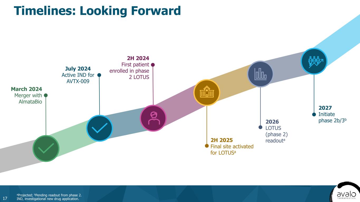 Overall HS prevalence2 HS diagnosed and treated3 Moderate- to-severe HS4 Biologics treated5 Diagnosed and Treated HS Population is Projected to Grow Substantially into a $10B+ Market by 20351 16 aHS diagnosis and treatment rates and biologic treatment rates are expected to increase over time. CAGR, compound annual growth rate; HCP, healthcare provider; HS, hidradenitis suppurativa; US, United States. 1. HS Market Research 2024. Avalo Therapeutics Data on File; 2. Garg A, et al. Am J Clin Dermatol. 2023;24:977-990; 3. Garg AX, et al. Dermatol Ther. 2022;3:581-594; 4. Ingram JR, et al. J Eur Acad Dermatol Venereol. 2022;36(9):1597-1605; 5. Rinderknecht FB, Naik HB. Int J Womens Dermatol. 2024;10(1):e130. 2023 US Base Data 2035 US Projected Potential Market Opportunity Overall prevalence of HS of 3.3M expected to grow to 3.5M Total Addressable Market Number of patients with HS diagnosed and treated will grow significantly from 30% to 45% of the total population, driven by new development and visibility with HCPs and patients Segment Addressable Market Increased recognition of disease leads to 60% growth of identified moderate to severe HS Treated Addressable Market New approvals will lead to more patients being treated with biologics, increasing from 30% to 40% share of segment (evidenced by the recent quickly growing use of Cosentyx in HS post-approval) MARKET DRIVERS 3.3 million 3.5 million (0.5% US population CAGR) 1.0 million 1.6 million (4% HS diagnosis CAGR)a 320,000 513,000 205,000 (40% on biologics in 2030)a 105,000 (33% on biologics in 2023)