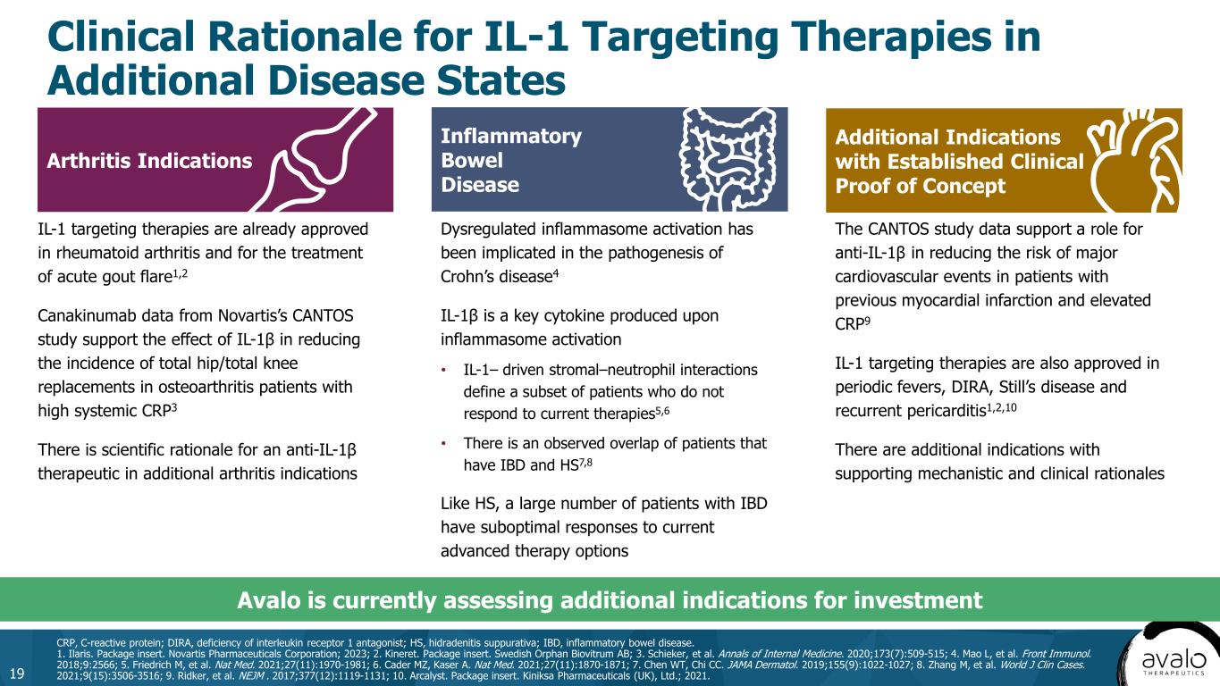 Arthritis Indications Inflammatory Bowel Disease Additional Indications with Established Clinical Proof of Concept Clinical Rationale for IL-1 Targeting Therapies in Additional Disease States 19 CRP, C-reactive protein; DIRA, deficiency of interleukin receptor 1 antagonist; HS, hidradenitis suppurativa; IBD, inflammatory bowel disease. 1. Ilaris. Package insert. Novartis Pharmaceuticals Corporation; 2023; 2. Kineret. Package insert. Swedish Orphan Biovitrum AB; 3. Schieker, et al. Annals of Internal Medicine. 2020;173(7):509-515; 4. Mao L, et al. Front Immunol. 2018;9:2566; 5. Friedrich M, et al. Nat Med. 2021;27(11):1970-1981; 6. Cader MZ, Kaser A. Nat Med. 2021;27(11):1870-1871; 7. Chen WT, Chi CC. JAMA Dermatol. 2019;155(9):1022-1027; 8. Zhang M, et al. World J Clin Cases. 2021;9(15):3506-3516; 9. Ridker, et al. NEJM . 2017;377(12):1119-1131; 10. Arcalyst. Package insert. Kiniksa Pharmaceuticals (UK), Ltd.; 2021. Dysregulated inflammasome activation has been implicated in the pathogenesis of Crohn’s disease4 IL-1β is a key cytokine produced upon inflammasome activation • IL-1– driven stromal–neutrophil interactions define a subset of patients who do not respond to current therapies5,6 • There is an observed overlap of patients that have IBD and HS7,8 Like HS, a large number of patients with IBD have suboptimal responses to current advanced therapy options IL-1 targeting therapies are already approved in rheumatoid arthritis and for the treatment of acute gout flare1,2 Canakinumab data from Novartis’s CANTOS study support the effect of IL-1β in reducing the incidence of total hip/total knee replacements in osteoarthritis patients with high systemic CRP3 There is scientific rationale for an anti-IL-1β therapeutic in additional arthritis indications The CANTOS study data support a role for anti-IL-1β in reducing the risk of major cardiovascular events in patients with previous myocardial infarction and elevated CRP9 IL-1 targeting therapies are also approved in periodic fevers, DIRA, Still’s disease and recurrent pericarditis1,2,10 There are additional indications with supporting mechanistic and clinical rationales Avalo is currently assessing additional indications for investment