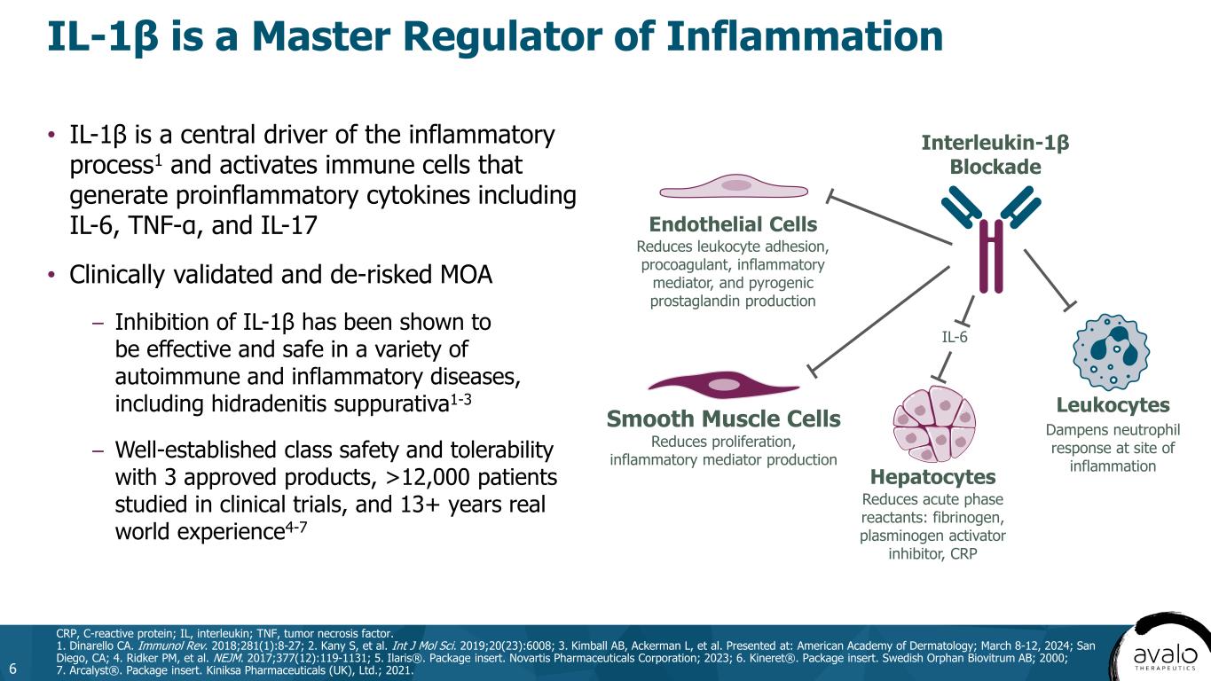 AVTX-009 A Highly Potent, Specific Inhibitor of IL-1β 5 • Originally developed by Eli Lilly1,2 • Stable 150 mg/mL dosage formulation3 – SC and IV administration – Initial presentation: prefilled syringe Post-approval plan: autoinjector • Clinical experience: 245 patients studied in phase 1 and phase 2 trials2,3-6 – Significant and rapid lowering of inflammatory biomarkers after a single dose of 0.6 mg – Well-tolerated and favorable safety profile at all doses up to 180 mg SC weekly • Potency and half-life expected to support up to Q4W dosing in hidradenitis suppurativa and potentially a longer dosing interval in other indications IL, interleukin; IV, intravenous; KD, dissociation constant; Q4W, every 4 weeks; SC, subcutaneous. 1. Bihorel S, et al. AAPS J. 2014;16(5):1009-1017; 2. Sloan-Lancaster J, et al. Diabetes Care. 2013;36(8):2239-2246; 3. Data on file; 4. NCT04983732. Clinicaltrials.gov. Accessed September 5, 2024. https://clinicaltrials.gov/study/NCT04983732; 5. NCT00942188. Clinicaltrials.gov. Accessed September 5, 2024. https://clinicaltrials.gov/study/NCT00942188; 6. NCT00380744. Clinicaltrials.gov. Accessed September 5, 2024. https://clinicaltrials.gov/study/NCT00380744. AVTX-0091 <3 IL-1β KD (pM) Binding Affinity for IL-1β 73% Subcutaneous Bioavailability 19-day Half-Life