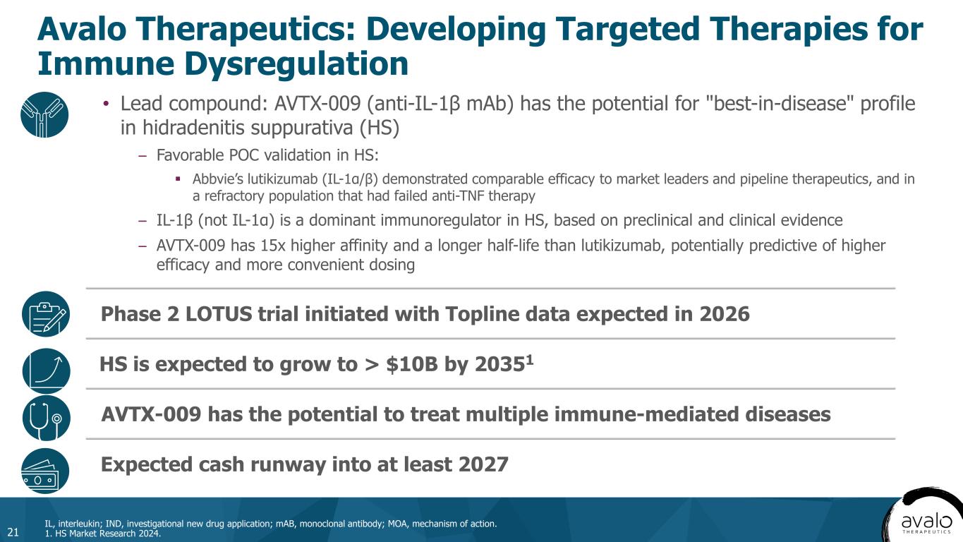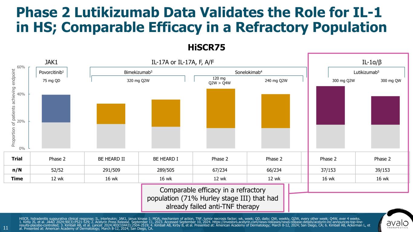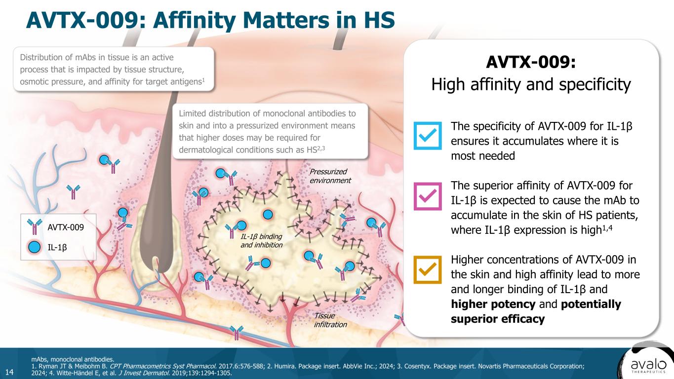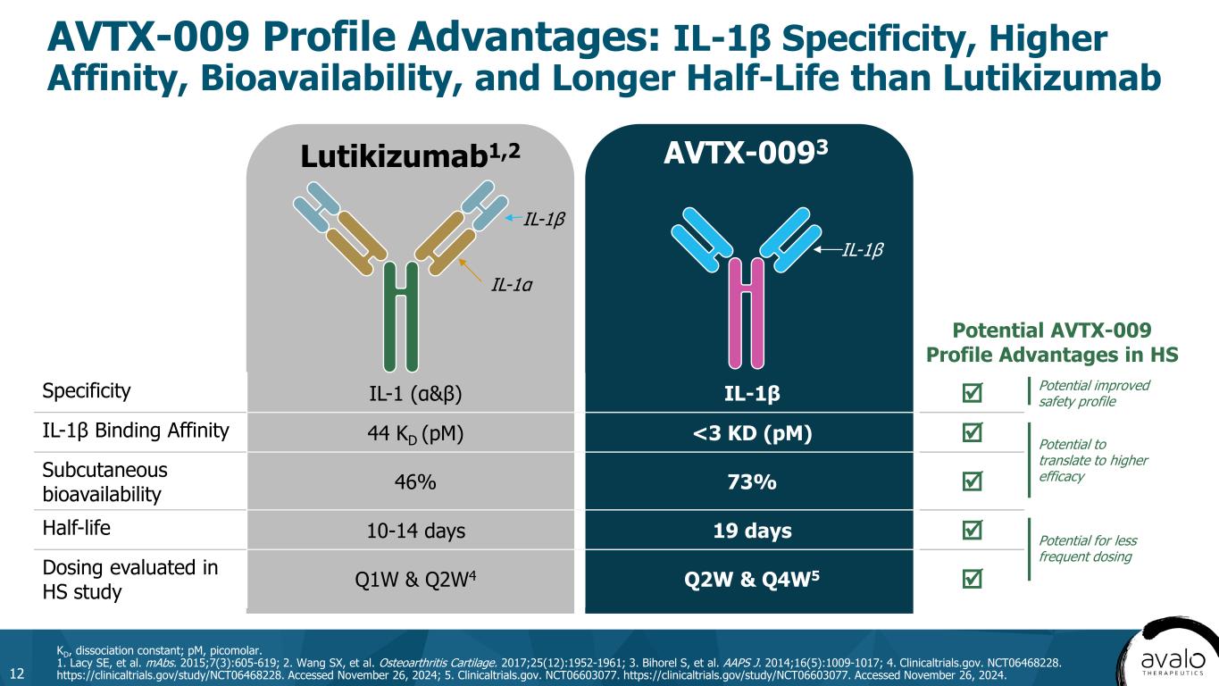 AVTX-009 Profile Advantages: IL-1β Specificity, Higher Affinity, Bioavailability, and Longer Half-Life than Lutikizumab 12 KD, dissociation constant; pM, picomolar. 1. Lacy SE, et al. mAbs. 2015;7(3):605-619; 2. Wang SX, et al. Osteoarthritis Cartilage. 2017;25(12):1952-1961; 3. Bihorel S, et al. AAPS J. 2014;16(5):1009-1017; 4. Clinicaltrials.gov. NCT06468228. https://clinicaltrials.gov/study/NCT06468228. Accessed November 26, 2024; 5. Clinicaltrials.gov. NCT06603077. https://clinicaltrials.gov/study/NCT06603077. Accessed November 26, 2024. Specificity IL-1 (α&β) IL-1β  IL-1β Binding Affinity 44 KD (pM) <3 KD (pM)  Subcutaneous bioavailability 46% 73%  Half-life 10-14 days 19 days  Dosing evaluated in HS study Q1W & Q2W4 Q2W & Q4W5  Lutikizumab1,2 AVTX-0093 IL-1β IL-1β IL-1α Potential AVTX-009 Profile Advantages in HS Potential to translate to higher efficacy Potential improved safety profile Potential for less frequent dosing