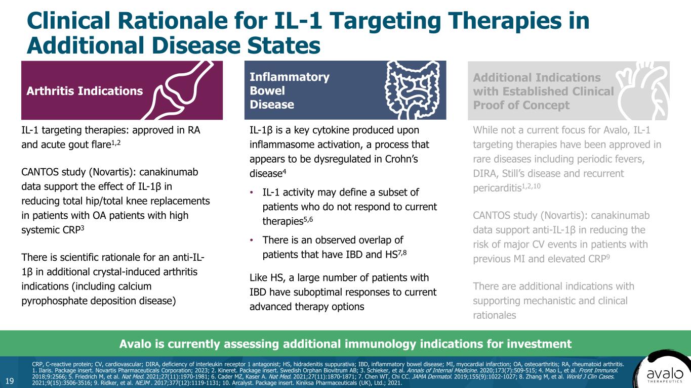 Arthritis Indications Inflammatory Bowel Disease Additional Indications with Established Clinical Proof of Concept Clinical Rationale for IL-1 Targeting Therapies in Additional Disease States 19 CRP, C-reactive protein; CV, cardiovascular; DIRA, deficiency of interleukin receptor 1 antagonist; HS, hidradenitis suppurativa; IBD, inflammatory bowel disease; MI, myocardial infarction; OA, osteoarthritis; RA, rheumatoid arthritis. 1. Ilaris. Package insert. Novartis Pharmaceuticals Corporation; 2023; 2. Kineret. Package insert. Swedish Orphan Biovitrum AB; 3. Schieker, et al. Annals of Internal Medicine. 2020;173(7):509-515; 4. Mao L, et al. Front Immunol. 2018;9:2566; 5. Friedrich M, et al. Nat Med. 2021;27(11):1970-1981; 6. Cader MZ, Kaser A. Nat Med. 2021;27(11):1870-1871; 7. Chen WT, Chi CC. JAMA Dermatol. 2019;155(9):1022-1027; 8. Zhang M, et al. World J Clin Cases. 2021;9(15):3506-3516; 9. Ridker, et al. NEJM . 2017;377(12):1119-1131; 10. Arcalyst. Package insert. Kiniksa Pharmaceuticals (UK), Ltd.; 2021. IL-1β is a key cytokine produced upon inflammasome activation, a process that appears to be dysregulated in Crohn’s disease4 • IL-1 activity may define a subset of patients who do not respond to current therapies5,6 • There is an observed overlap of patients that have IBD and HS7,8 Like HS, a large number of patients with IBD have suboptimal responses to current advanced therapy options IL-1 targeting therapies: approved in RA and acute gout flare1,2 CANTOS study (Novartis): canakinumab data support the effect of IL-1β in reducing total hip/total knee replacements in patients with OA patients with high systemic CRP3 There is scientific rationale for an anti-IL- 1β in additional crystal-induced arthritis indications (including calcium pyrophosphate deposition disease) While not a current focus for Avalo, IL-1 targeting therapies have been approved in rare diseases including periodic fevers, DIRA, Still’s disease and recurrent pericarditis1,2,10 CANTOS study (Novartis): canakinumab data support anti-IL-1β in reducing the risk of major CV events in patients with previous MI and elevated CRP9 There are additional indications with supporting mechanistic and clinical rationales Avalo is currently assessing additional immunology indications for investment