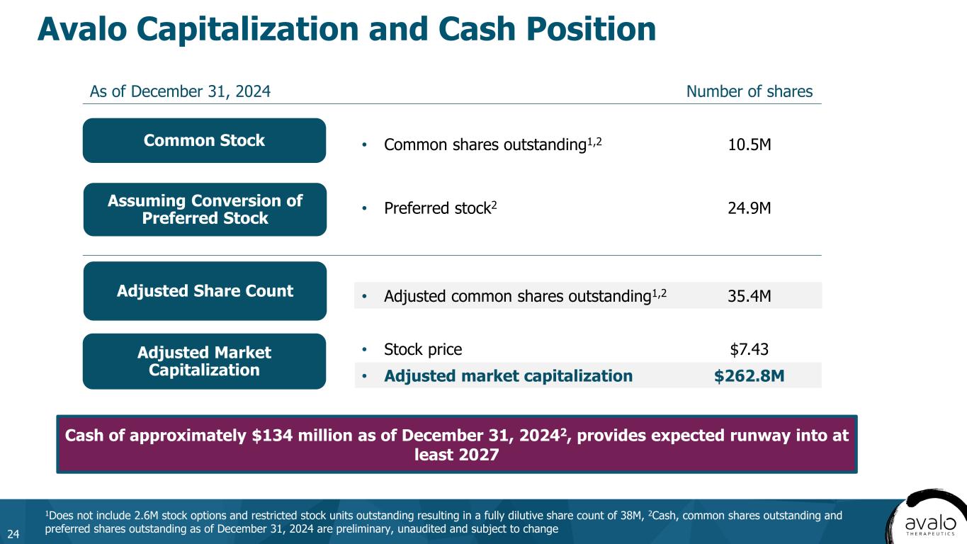 Avalo Capitalization and Cash Position 1Does not include 2.6M stock options and restricted stock units outstanding resulting in a fully dilutive share count of 38M, 2Cash, common shares outstanding and preferred shares outstanding as of December 31, 2024 are preliminary, unaudited and subject to change 24 As of December 31, 2024 Number of shares • Common shares outstanding1,2 10.5M • Preferred stock2 24.9M • Adjusted common shares outstanding1,2 35.4M • Stock price $7.43 • Adjusted market capitalization $262.8M Common Stock Assuming Conversion of Preferred Stock Adjusted Share Count Adjusted Market Capitalization Cash of approximately $134 million as of December 31, 20242, provides expected runway into at least 2027