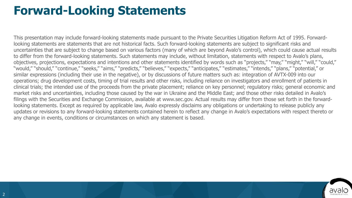 Forward-Looking Statements This presentation may include forward-looking statements made pursuant to the Private Securities Litigation Reform Act of 1995. Forward- looking statements are statements that are not historical facts. Such forward-looking statements are subject to significant risks and uncertainties that are subject to change based on various factors (many of which are beyond Avalo’s control), which could cause actual results to differ from the forward-looking statements. Such statements may include, without limitation, statements with respect to Avalo’s plans, objectives, projections, expectations and intentions and other statements identified by words such as “projects,” “may,” “might,” “will,” “could,” “would,” “should,” “continue,” “seeks,” “aims,” “predicts,” “believes,” “expects,” “anticipates,” “estimates,” “intends,” “plans,” “potential,” or similar expressions (including their use in the negative), or by discussions of future matters such as: integration of AVTX-009 into our operations; drug development costs, timing of trial results and other risks, including reliance on investigators and enrollment of patients in clinical trials; the intended use of the proceeds from the private placement; reliance on key personnel; regulatory risks; general economic and market risks and uncertainties, including those caused by the war in Ukraine and the Middle East; and those other risks detailed in Avalo’s filings with the Securities and Exchange Commission, available at www.sec.gov. Actual results may differ from those set forth in the forward- looking statements. Except as required by applicable law, Avalo expressly disclaims any obligations or undertaking to release publicly any updates or revisions to any forward-looking statements contained herein to reflect any change in Avalo’s expectations with respect thereto or any change in events, conditions or circumstances on which any statement is based. 2