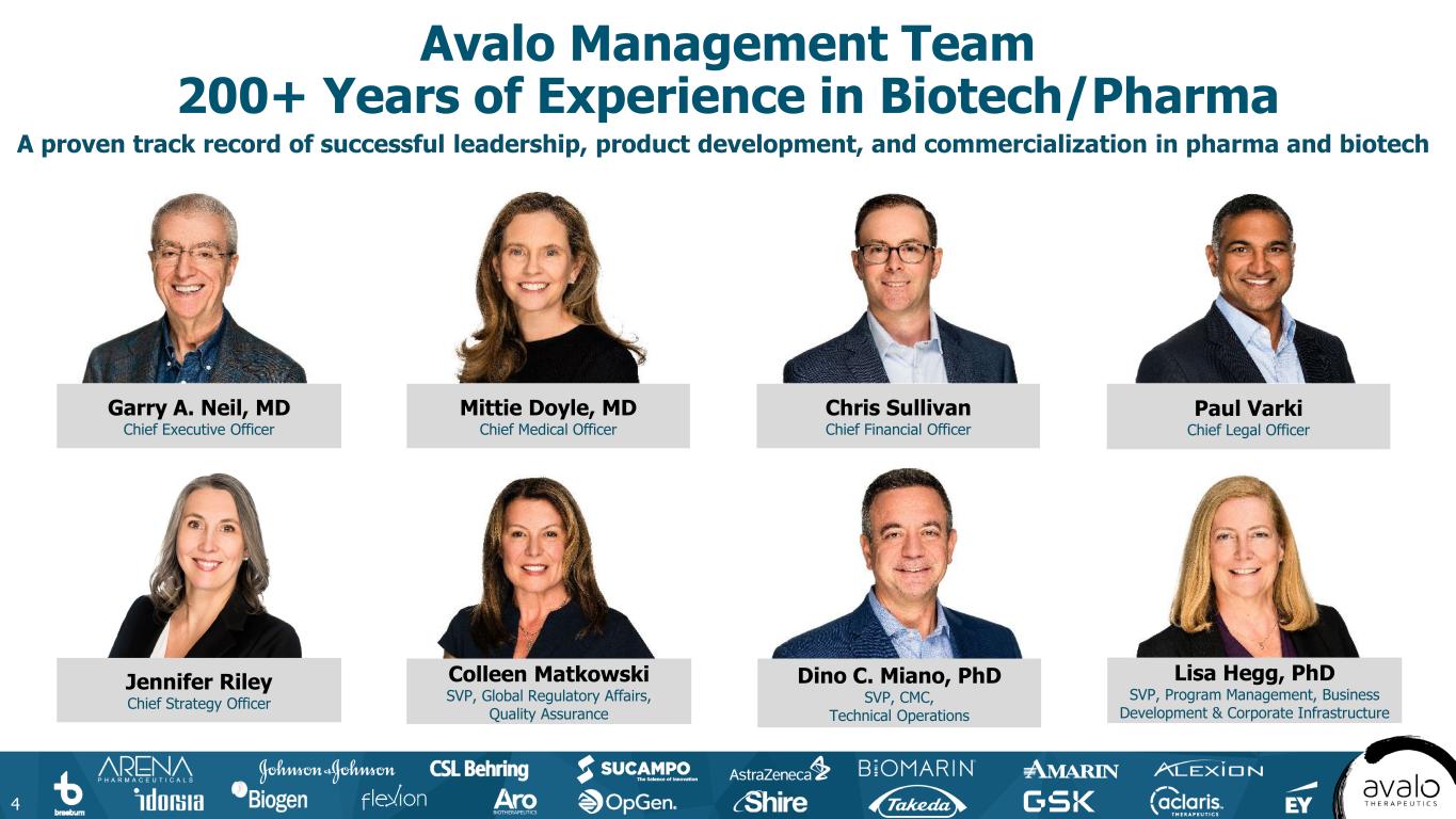 Avalo Therapeutics: Developing Targeted Therapies for Immune Mediated Inflammatory Diseases 3 Lead compound: AVTX-009 (anti-IL-1β mAb) has the potential for "best-in- disease" profile in hidradenitis suppurativa (HS) • Abbvie’s lutikizumab (IL-1α/β) demonstrated comparable efficacy to market leaders and pipeline therapeutics, and in a refractory population that had failed anti-TNF therapy​ • IL-1β (not IL-1α) is a dominant immunoregulator in HS, based on preclinical and clinical evidence1,2,3 • AVTX-009 has 15x higher affinity and a longer half-life than lutikizumab, potentially predictive of higher efficacy and more convenient dosing​4 IL, interleukin; IND, investigational new drug application; mAB, monoclonal antibody; MOA, mechanism of action. 1. Vossen ARJV, et al. J Invest Dermatol. 2020;140(7):1463-1466.e2; 2. Kelly G, et al. Br J Dermatol. 2015;173(6):1431-1439; 3. 4. Kimball AB, et al. Presented at: American Academy of Dermatology; March 8-12, 2024; San Diego, CA; 4. Bihorel S, et al. AAPS J. 2014;16(5):1009-1017; 5. HS Market Research 2024. Expected cash runway into at least 2027 AVTX-009 has the potential to treat multiple immune-mediated diseases HS market is expected to grow to > $10B by 20355 Phase 2 LOTUS trial in HS initiated with Topline data expected mid-2026