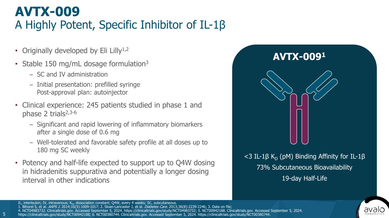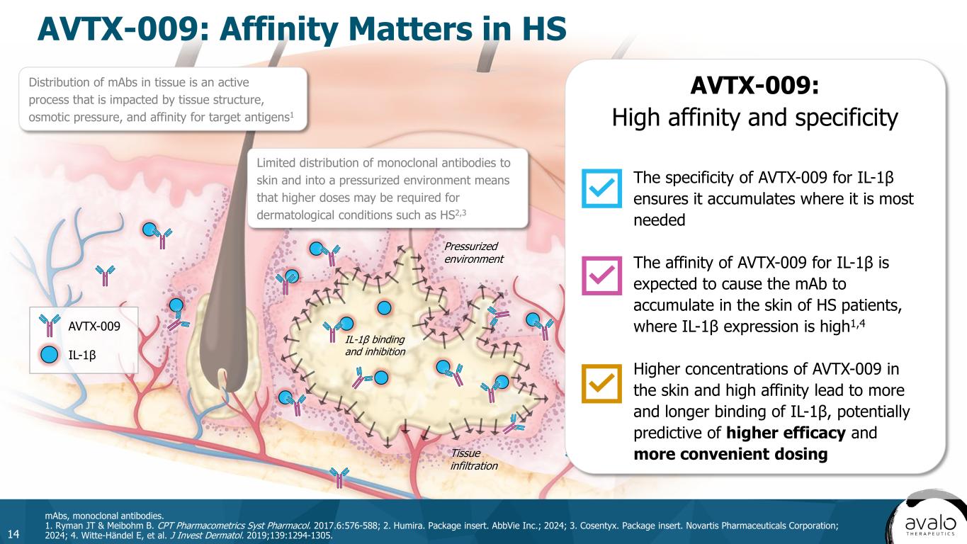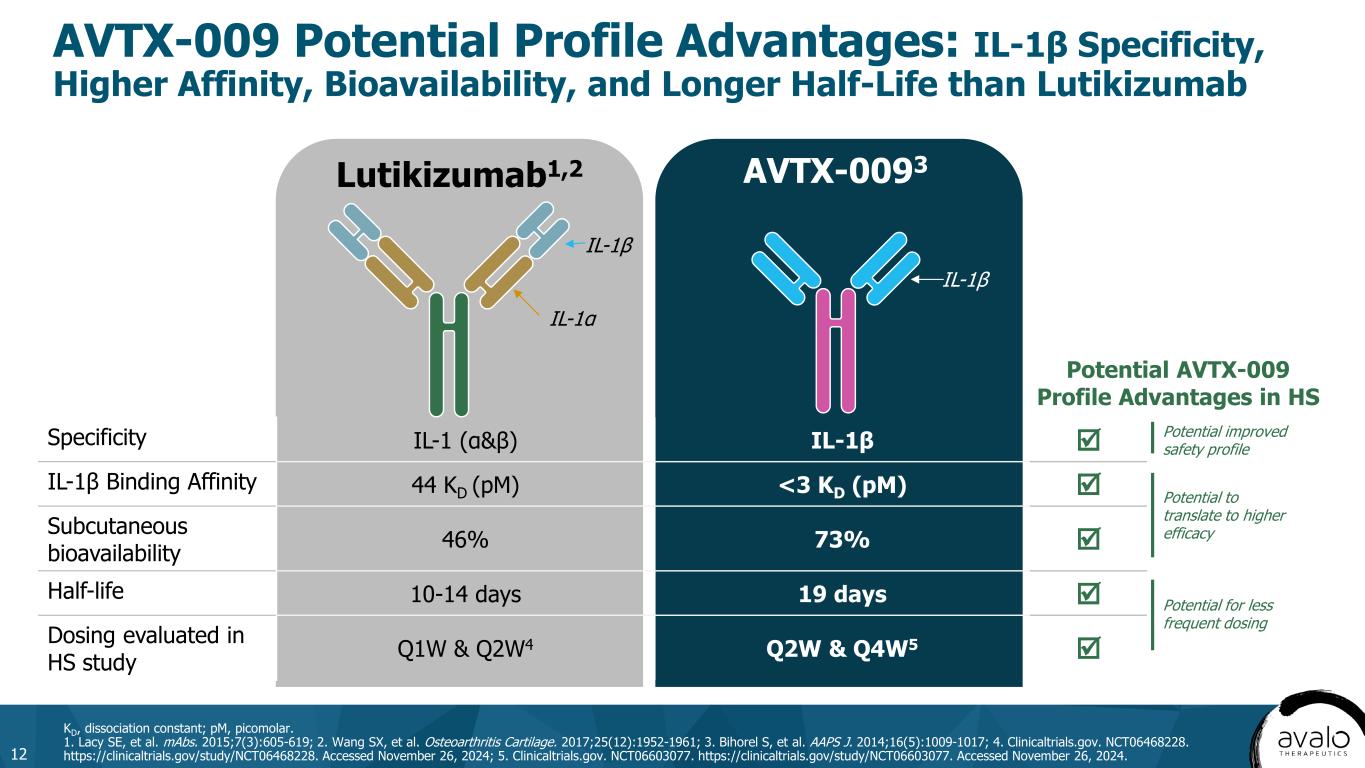 AVTX-009 Potential Profile Advantages: IL-1β Specificity, Higher Affinity, Bioavailability, and Longer Half-Life than Lutikizumab 12 KD, dissociation constant; pM, picomolar. 1. Lacy SE, et al. mAbs. 2015;7(3):605-619; 2. Wang SX, et al. Osteoarthritis Cartilage. 2017;25(12):1952-1961; 3. Bihorel S, et al. AAPS J. 2014;16(5):1009-1017; 4. Clinicaltrials.gov. NCT06468228. https://clinicaltrials.gov/study/NCT06468228. Accessed November 26, 2024; 5. Clinicaltrials.gov. NCT06603077. https://clinicaltrials.gov/study/NCT06603077. Accessed November 26, 2024. Specificity IL-1 (α&β) IL-1β  IL-1β Binding Affinity 44 KD (pM) <3 KD (pM)  Subcutaneous bioavailability 46% 73%  Half-life 10-14 days 19 days  Dosing evaluated in HS study Q1W & Q2W4 Q2W & Q4W5  Lutikizumab1,2 AVTX-0093 IL-1β IL-1β IL-1α Potential AVTX-009 Profile Advantages in HS Potential to translate to higher efficacy Potential improved safety profile Potential for less frequent dosing