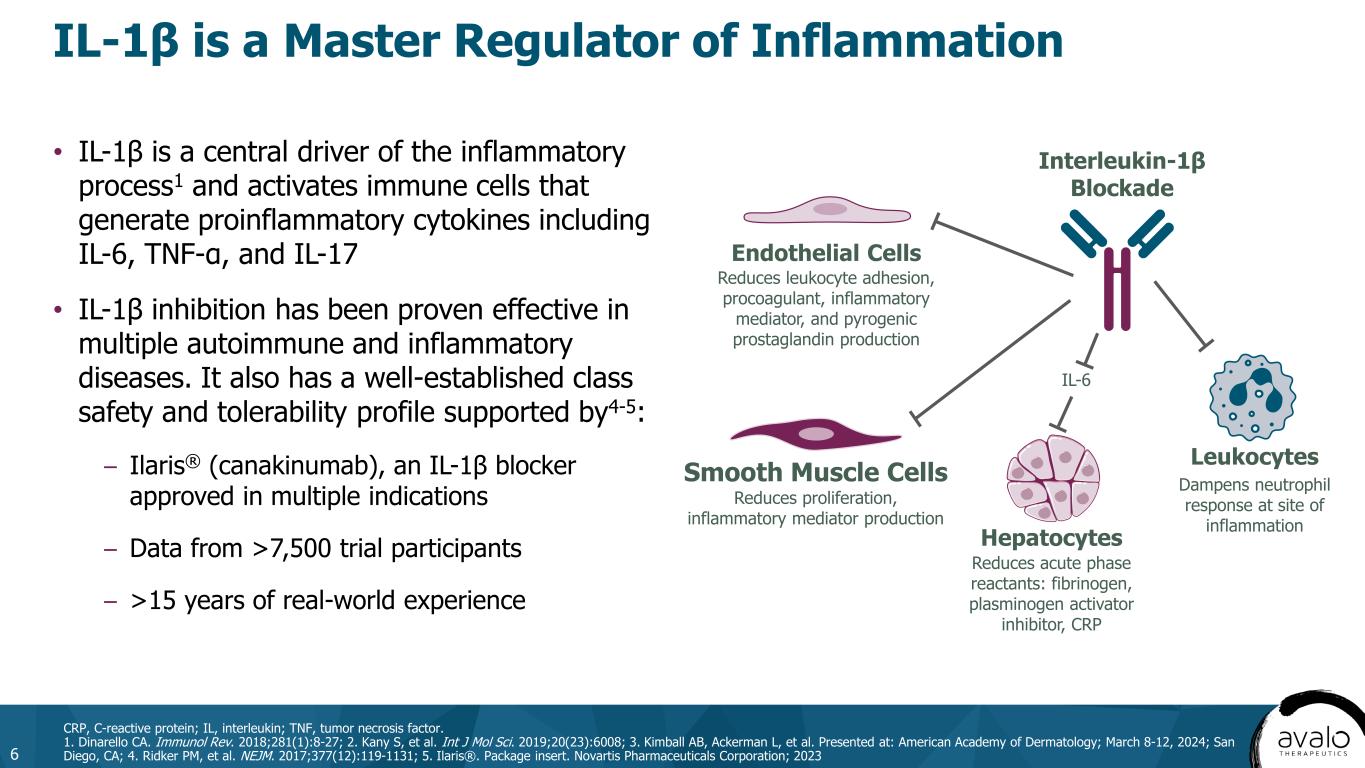 AVTX-009 A Highly Potent, Specific Inhibitor of IL-1β 5 • Originally developed by Eli Lilly1,2 • Stable 150 mg/mL dosage formulation3 – SC and IV administration – Initial presentation: prefilled syringe Post-approval plan: autoinjector • Clinical experience: 245 patients studied in phase 1 and phase 2 trials2,3-6 – Significant and rapid lowering of inflammatory biomarkers after a single dose of 0.6 mg – Well-tolerated and favorable safety profile at all doses up to 180 mg SC weekly • Potency and half-life expected to support up to Q4W dosing in hidradenitis suppurativa and potentially a longer dosing interval in other indications IL, interleukin; IV, intravenous; KD, dissociation constant; Q4W, every 4 weeks; SC, subcutaneous. 1. Bihorel S, et al. AAPS J. 2014;16(5):1009-1017; 2. Sloan-Lancaster J, et al. Diabetes Care. 2013;36(8):2239-2246; 3. Data on file; 4. NCT04983732. Clinicaltrials.gov. Accessed September 5, 2024. https://clinicaltrials.gov/study/NCT04983732; 5. NCT00942188. Clinicaltrials.gov. Accessed September 5, 2024. https://clinicaltrials.gov/study/NCT00942188; 6. NCT00380744. Clinicaltrials.gov. Accessed September 5, 2024. https://clinicaltrials.gov/study/NCT00380744. AVTX-0091 <3 IL-1β KD (pM) Binding Affinity for IL-1β 73% Subcutaneous Bioavailability 19-day Half-Life