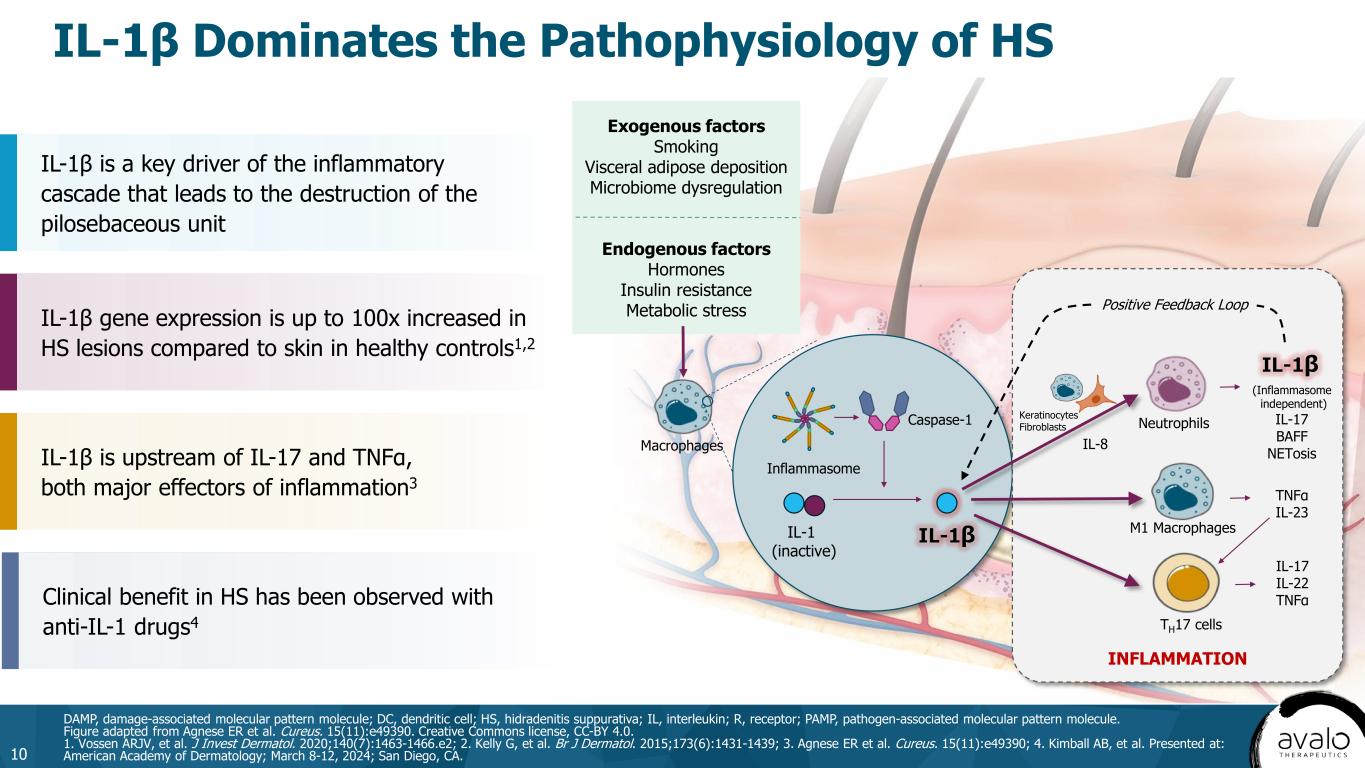 There is a Large Unmet Need in HS with a Majority of Patients Failing to Respond Adequately to anti-TNF and anti-IL-17 biologics​ 9 0% 10% 20% 30% 40% 50% 60% 70% 80% 90% General pain/discomfort Restricted/painful movement Pain on sitting Malodorous drainage Low mood/depression Pr op or tio n of p at ie nt s re po rti ng a s ym pt om Mild HS (n = 1179) Moderate HS (n = 523) Severe HS (n = 85) Severe Impact on Quality of Life: A large proportion of patients still report significant and life- disrupting symptoms with existing treatment options1,2,a HS, hidradenitis suppurativa. aCurrent treatments include antibiotics, retinoids, steroids, Cosentyx®, Humira®. 1. Ingram JR, et al. J Eur Acad Dermatol Venereol. 2022;36(9):1597-1605; 2. Kimball AB, et al. Dermatol Ther (Heidelb). 2024;14(1):83-98.