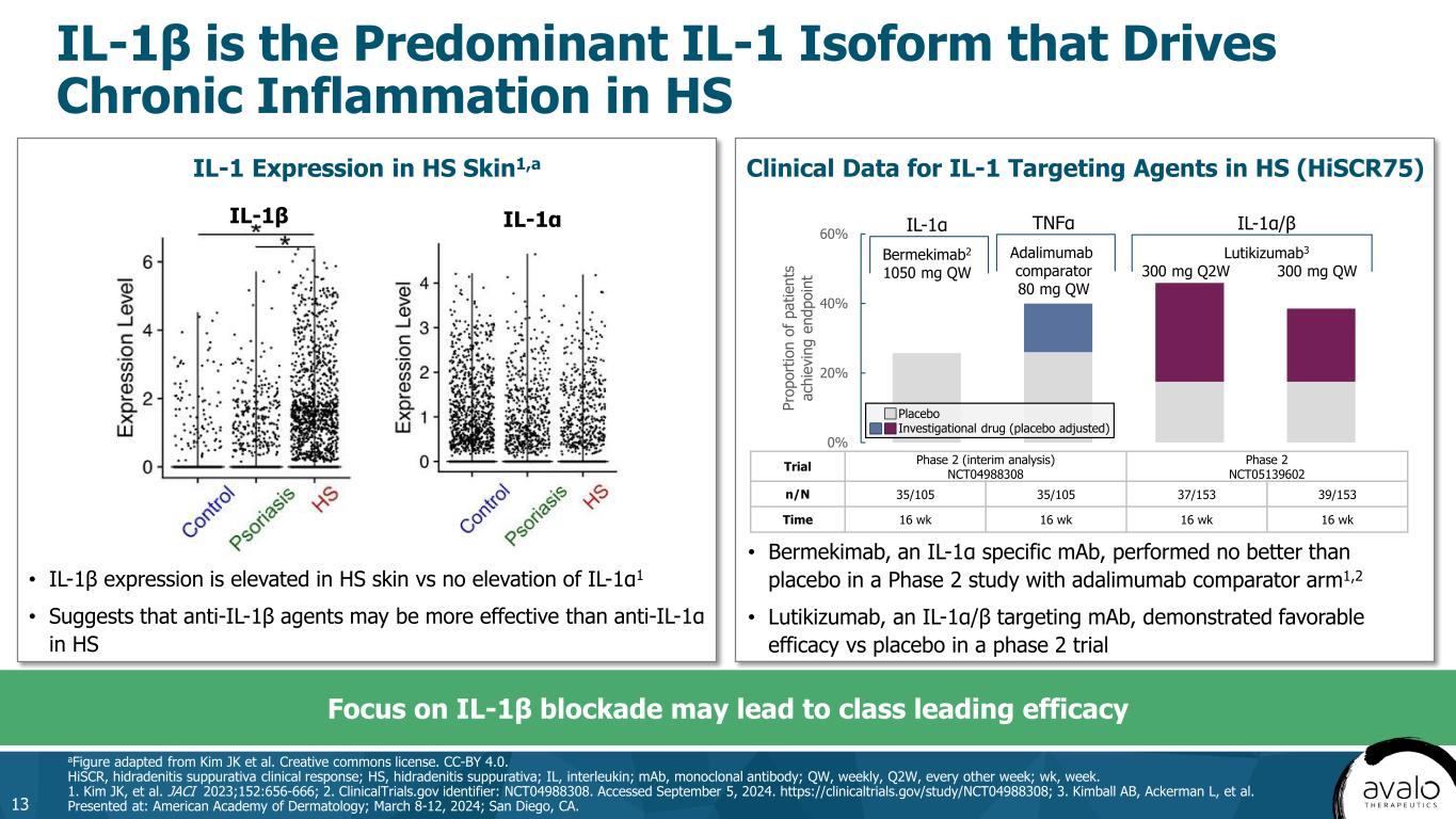 IL-1β is the Predominant IL-1 Isoform that Drives Chronic Inflammation in HS 13 aFigure adapted from Kim JK et al. Creative commons license. CC-BY 4.0. HiSCR, hidradenitis suppurativa clinical response; HS, hidradenitis suppurativa; IL, interleukin; mAb, monoclonal antibody; QW, weekly, Q2W, every other week; wk, week. 1. Kim JK, et al. JACI 2023;152:656-666; 2. ClinicalTrials.gov identifier: NCT04988308. Accessed September 5, 2024. https://clinicaltrials.gov/study/NCT04988308; 3. Kimball AB, Ackerman L, et al. Presented at: American Academy of Dermatology; March 8-12, 2024; San Diego, CA. IL-1 Expression in HS Skin1,a Focus on IL-1β blockade may lead to class leading efficacy • IL-1β expression is elevated in HS skin vs no elevation of IL-1α1 • Suggests that anti-IL-1β agents may be more effective than anti-IL-1α in HS Trial Phase 2 (interim analysis) NCT04988308 Phase 2 NCT05139602 n/N 35/105 35/105 37/153 39/153 Time 16 wk 16 wk 16 wk 16 wk Clinical Data for IL-1 Targeting Agents in HS (HiSCR75) 0% 20% 40% 60% Pr op or tio n of p at ie nt s ac hi ev in g en dp oi nt IL-1α Bermekimab2 1050 mg QW IL-1α/β Lutikizumab3 300 mg Q2W 300 mg QW Placebo Investigational drug (placebo adjusted) TNFα Adalimumab comparator 80 mg QW IL-1β IL-1α • Bermekimab, an IL-1α specific mAb, performed no better than placebo in a Phase 2 study with adalimumab comparator arm1,2 • Lutikizumab, an IL-1α/β targeting mAb, demonstrated favorable efficacy vs placebo in a phase 2 trial