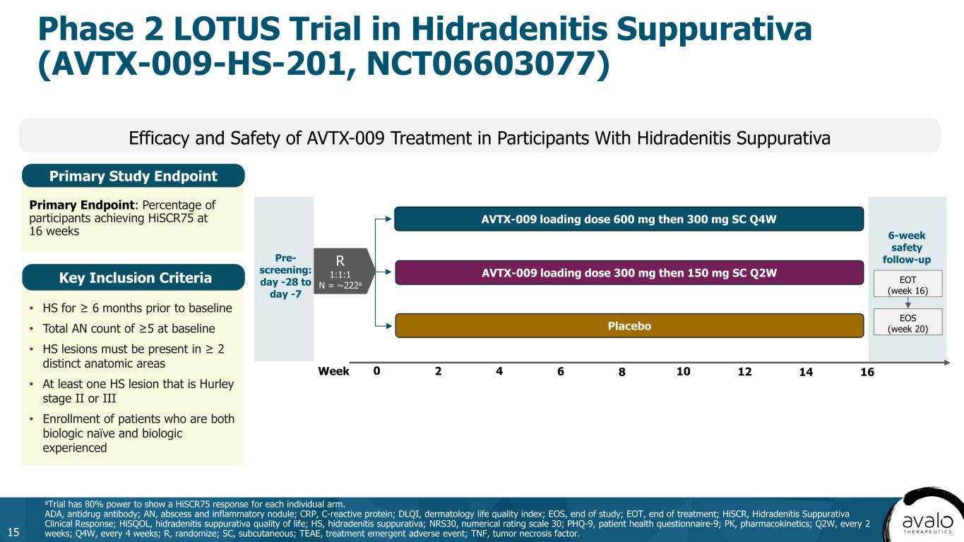 • HS for ≥ 6 months prior to baseline • Total AN count of ≥5 at baseline • HS lesions must be present in ≥ 2 distinct anatomic areas • At least one HS lesion that is Hurley stage II or III • Enrollment of patients who are both biologic naïve and biologic experienced Primary Endpoint: Percentage of participants achieving HiSCR75 at 16 weeks Efficacy and Safety of AVTX-009 Treatment in Participants With Hidradenitis Suppurativa Key Inclusion Criteria Primary Study Endpoint AVTX-009 loading dose 600 mg then 300 mg SC Q4W AVTX-009 loading dose 300 mg then 150 mg SC Q2W Placebo 6-week safety follow-up 0 2 4 8 10 12 14 Pre- screening: day -28 to day -7 EOT (week 16) EOS (week 20) Week 6 16 Phase 2 LOTUS Trial in Hidradenitis Suppurativa (AVTX-009-HS-201, NCT06603077) 15 aTrial has 80% power to show a HiSCR75 response for each individual arm. ADA, antidrug antibody; AN, abscess and inflammatory nodule; CRP, C-reactive protein; DLQI, dermatology life quality index; EOS, end of study; EOT, end of treatment; HiSCR, Hidradenitis Suppurativa Clinical Response; HiSQOL, hidradenitis suppurativa quality of life; HS, hidradenitis suppurativa; NRS30, numerical rating scale 30; PHQ-9, patient health questionnaire-9; PK, pharmacokinetics; Q2W, every 2 weeks; Q4W, every 4 weeks; R, randomize; SC, subcutaneous; TEAE, treatment emergent adverse event; TNF, tumor necrosis factor. R 1:1:1 N = ~222a