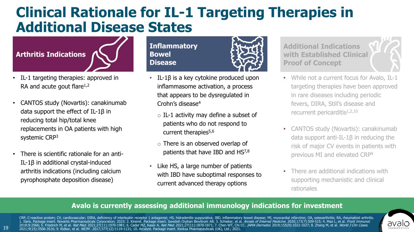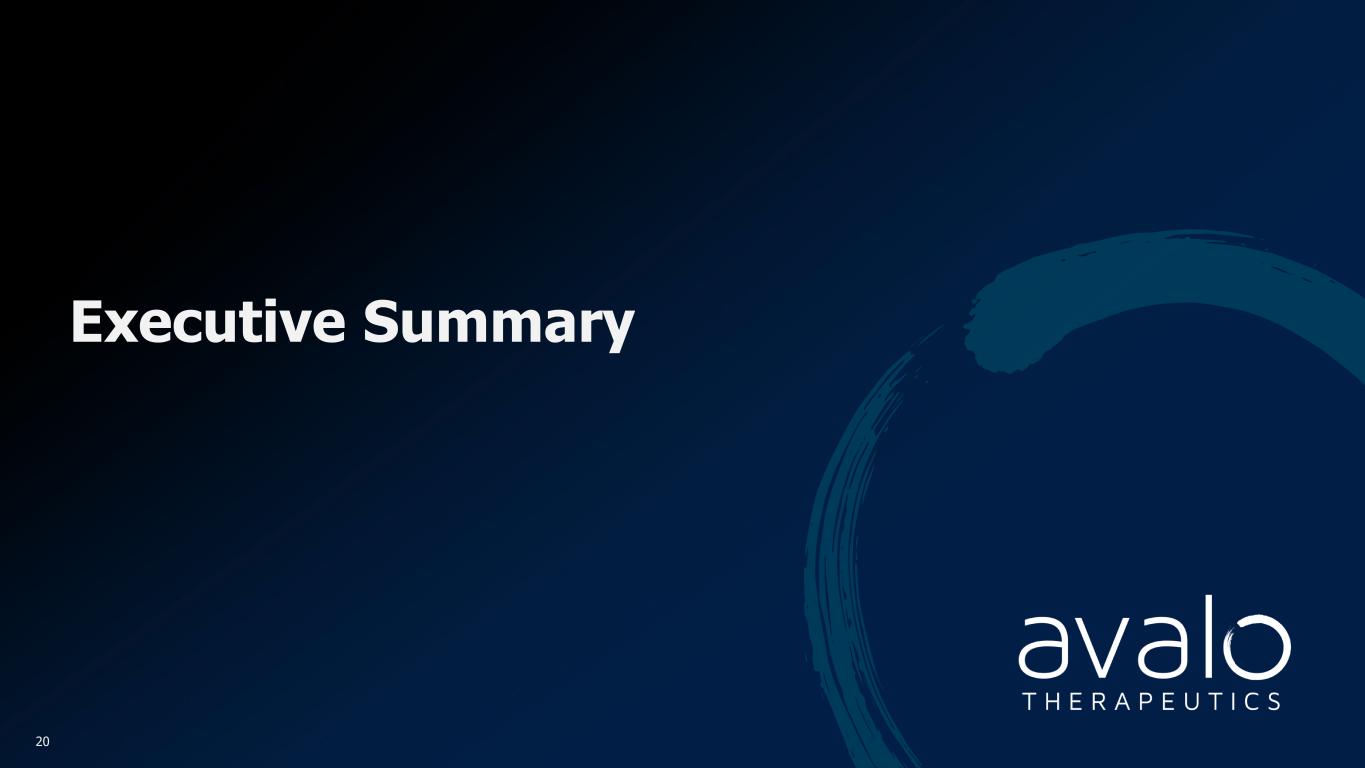 Arthritis Indications Inflammatory Bowel Disease Additional Indications with Established Clinical Proof of Concept Clinical Rationale for IL-1 Targeting Therapies in Additional Disease States 19 CRP, C-reactive protein; CV, cardiovascular; DIRA, deficiency of interleukin receptor 1 antagonist; HS, hidradenitis suppurativa; IBD, inflammatory bowel disease; MI, myocardial infarction; OA, osteoarthritis; RA, rheumatoid arthritis. 1. Ilaris. Package insert. Novartis Pharmaceuticals Corporation; 2023; 2. Kineret. Package insert. Swedish Orphan Biovitrum AB; 3. Schieker, et al. Annals of Internal Medicine. 2020;173(7):509-515; 4. Mao L, et al. Front Immunol. 2018;9:2566; 5. Friedrich M, et al. Nat Med. 2021;27(11):1970-1981; 6. Cader MZ, Kaser A. Nat Med. 2021;27(11):1870-1871; 7. Chen WT, Chi CC. JAMA Dermatol. 2019;155(9):1022-1027; 8. Zhang M, et al. World J Clin Cases. 2021;9(15):3506-3516; 9. Ridker, et al. NEJM . 2017;377(12):1119-1131; 10. Arcalyst. Package insert. Kiniksa Pharmaceuticals (UK), Ltd.; 2021. • IL-1β is a key cytokine produced upon inflammasome activation, a process that appears to be dysregulated in Crohn’s disease4 o IL-1 activity may define a subset of patients who do not respond to current therapies5,6 o There is an observed overlap of patients that have IBD and HS7,8 • Like HS, a large number of patients with IBD have suboptimal responses to current advanced therapy options • IL-1 targeting therapies: approved in RA and acute gout flare1,2 • CANTOS study (Novartis): canakinumab data support the effect of IL-1β in reducing total hip/total knee replacements in OA patients with high systemic CRP3 • There is scientific rationale for an anti- IL-1β in additional crystal-induced arthritis indications (including calcium pyrophosphate deposition disease) • While not a current focus for Avalo, IL-1 targeting therapies have been approved in rare diseases including periodic fevers, DIRA, Still’s disease and recurrent pericarditis1,2,10 • CANTOS study (Novartis): canakinumab data support anti-IL-1β in reducing the risk of major CV events in patients with previous MI and elevated CRP9 • There are additional indications with supporting mechanistic and clinical rationales Avalo is currently assessing additional immunology indications for investment