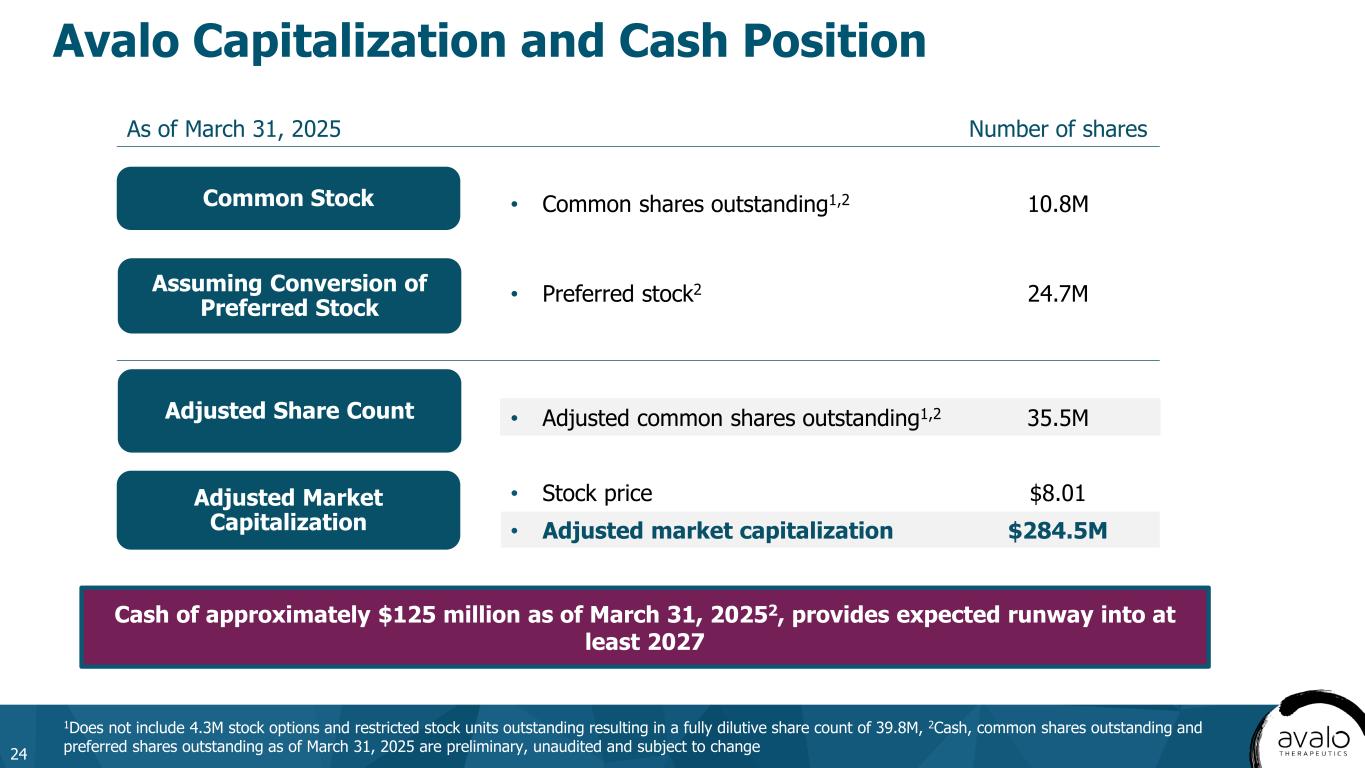 Avalo Capitalization and Cash Position 1Does not include 4.3M stock options and restricted stock units outstanding resulting in a fully dilutive share count of 39.8M, 2Cash, common shares outstanding and preferred shares outstanding as of March 31, 2025 are preliminary, unaudited and subject to change 24 As of March 31, 2025 Number of shares • Common shares outstanding1,2 10.8M • Preferred stock2 24.7M • Adjusted common shares outstanding1,2 35.5M • Stock price $8.01 • Adjusted market capitalization $284.5M Common Stock Assuming Conversion of Preferred Stock Adjusted Share Count Adjusted Market Capitalization Cash of approximately $125 million as of March 31, 20252, provides expected runway into at least 2027