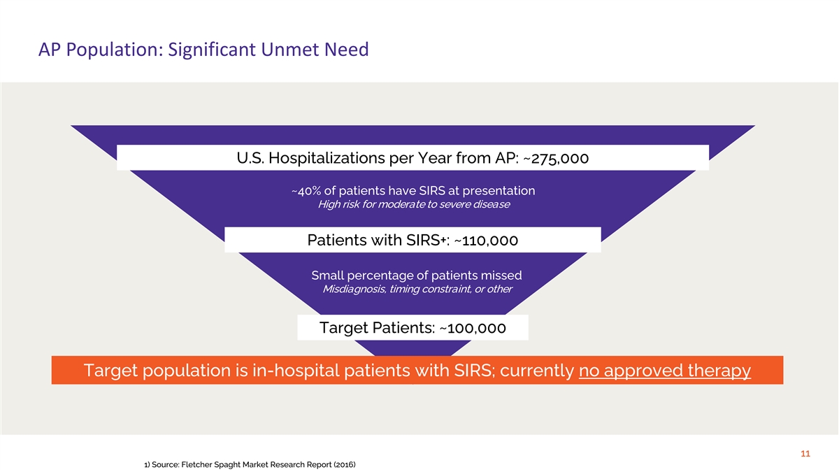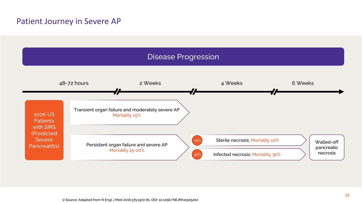 AP Population: Significant Unmet Need U.S. Hospitalizations per Year from AP: ~275,000 ~40% of patients have SIRS at presentation High risk for moderate to severe disease Patients with SIRS+: ~110,000 Small percentage of patients missed Misdiagnosis, timing constraint, or other Target Patients: ~100,000 Target population is in-hospital patients with SIRS; currently no approved therapy 11 1) Source: Fletcher Spaght Market Research Report (2016)
