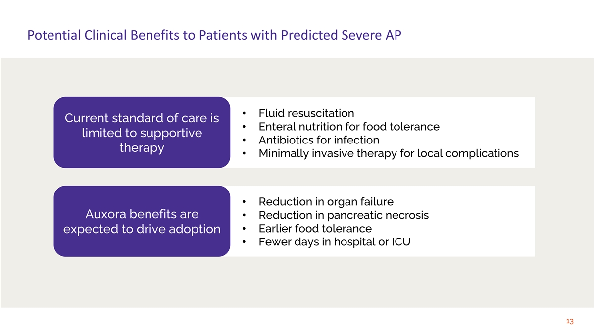 Potential Clinical Benefits to Patients with Predicted Severe AP • Fluid resuscitation Current standard of care is • Enteral nutrition for food tolerance limited to supportive • Antibiotics for infection therapy • Minimally invasive therapy for local complications • Reduction in organ failure Auxora benefits are • Reduction in pancreatic necrosis • Earlier food tolerance expected to drive adoption • Fewer days in hospital or ICU 13