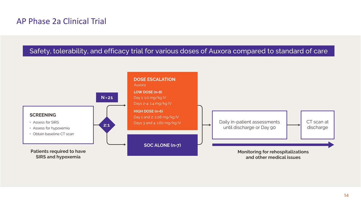 AP Phase 2a Clinical Trial Safety, tolerability, and efficacy trial for various doses of Auxora compared to standard of care 14