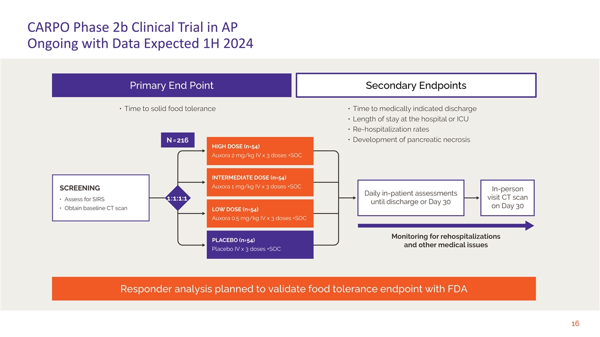Positive Phase 2a Results on Potential Pivotal Trial Primary Endpoints Rapid Increase in Patients Tolerating Solid Diet >2 Fewer Days Spent in Hospital Potential Pivotal Trial Primary Endpoint Median Hospital Stay SOC patients (n=7) 6.0 days 100 93% Auxora-treated patients (n=14) 3.7 days 90 80 1 Only Auxora Patients Improved on CTSI Scores 70 1 Moderate to Severe CTSI Scores 60 SOC patients (n=4) 0/4 (0%) 50% 50 43% Auxora-treated patients (n=8) 3/8 (38%) 40 30 50% Reduction in Persistent SIRS 20 14% 14% 7% Patients with Persistent SIRS 10 SOC patients (n=7) 5/7 (71%) 0 Auxora Standard of Care Auxora-treated patients (n=14) 5/14 (36%) (n=14) (n=7) 24 hours 72 hours Discharge 1) CTSI: CT Severity Index 15 % of Patients Tolerating Solid Diet