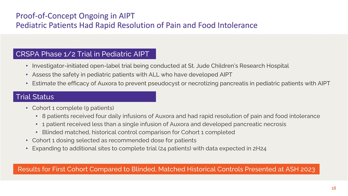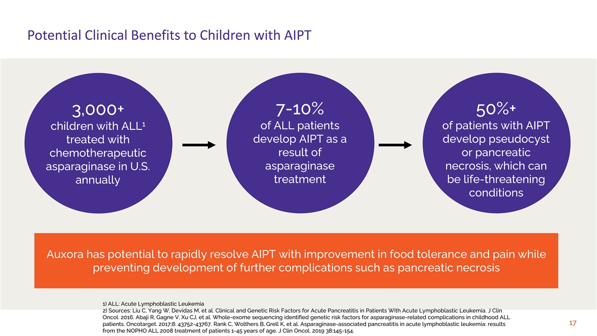 Potential Clinical Benefits to Children with AIPT 7-10% 50%+ 3,000+ 1 of ALL patients of patients with AIPT children with ALL treated with develop AIPT as a develop pseudocyst result of or pancreatic chemotherapeutic asparaginase necrosis, which can asparaginase in U.S. treatment be life-threatening annually conditions Auxora has potential to rapidly resolve AIPT with improvement in food tolerance and pain while preventing development of further complications such as pancreatic necrosis 1) ALL: Acute Lymphoblastic Leukemia 2) Sources: Liu C, Yang W, Devidas M, et al. Clinical and Genetic Risk Factors for Acute Pancreatitis in Patients With Acute Lymphoblastic Leukemia. J Clin Oncol. 2016. Abaji R, Gagne V, Xu CJ, et al. Whole-exome sequencing identified genetic risk factors for asparaginase-related complications in childhood ALL 17 patients. Oncotarget. 2017;8: 43752-43767. Rank C, Wolthers B, Grell K, et al. Asparaginase-associated pancreatitis in acute lymphoblastic leukemia: results from the NOPHO ALL 2008 treatment of patients 1-45 years of age. J Clin Oncol. 2019 38:145-154.